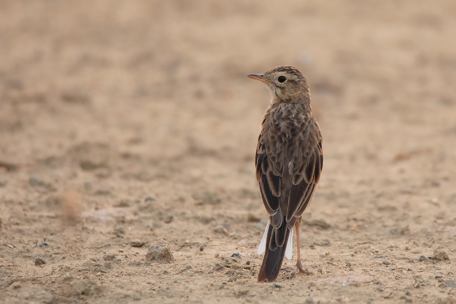 The typical tail pattern of Richard’s Pipit has extensive white on the 2 outermost pairs of tail feathers. The second outermost pair has nearly all white inner web with dark base (much smaller white area in Blyth’s Pipit). (Date 4 December 2018)