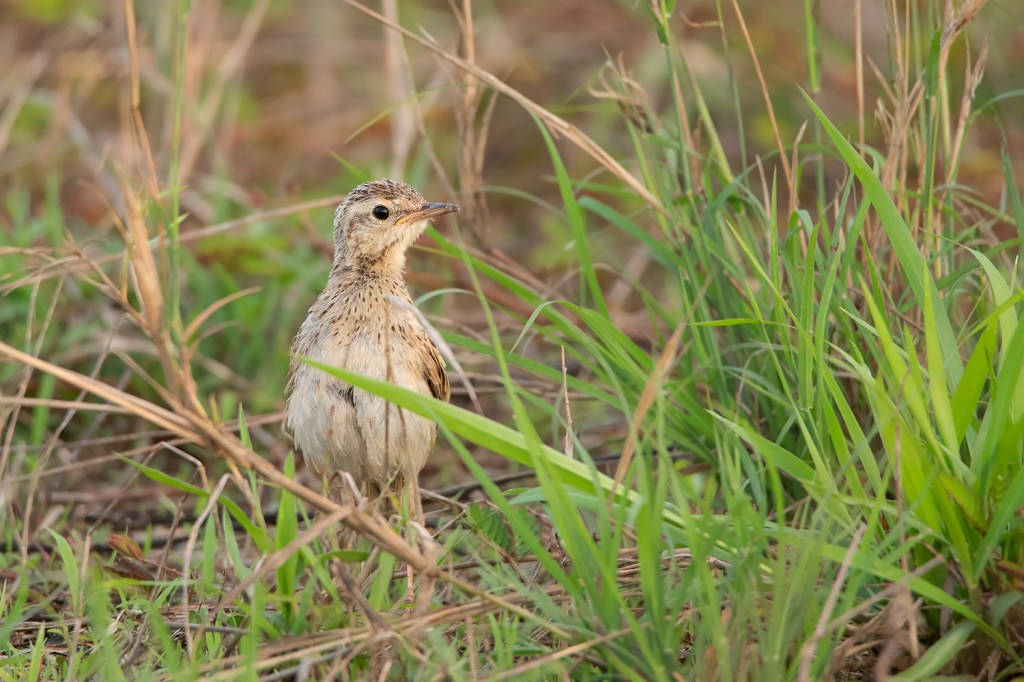Since Paddyfield Pipit is the only resident pipit in Thailand, it’s the only species that can be seen in fresh juvenile plumage. The juvenile has much bolder plumage markings than the adult. The upperparts are dark with contrasting pale fringes, and the secondaries are more rufous.