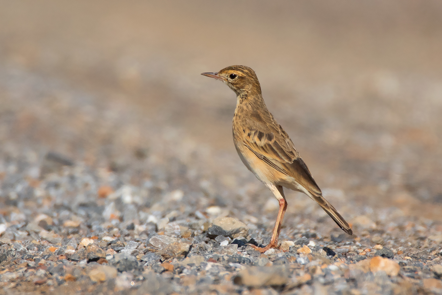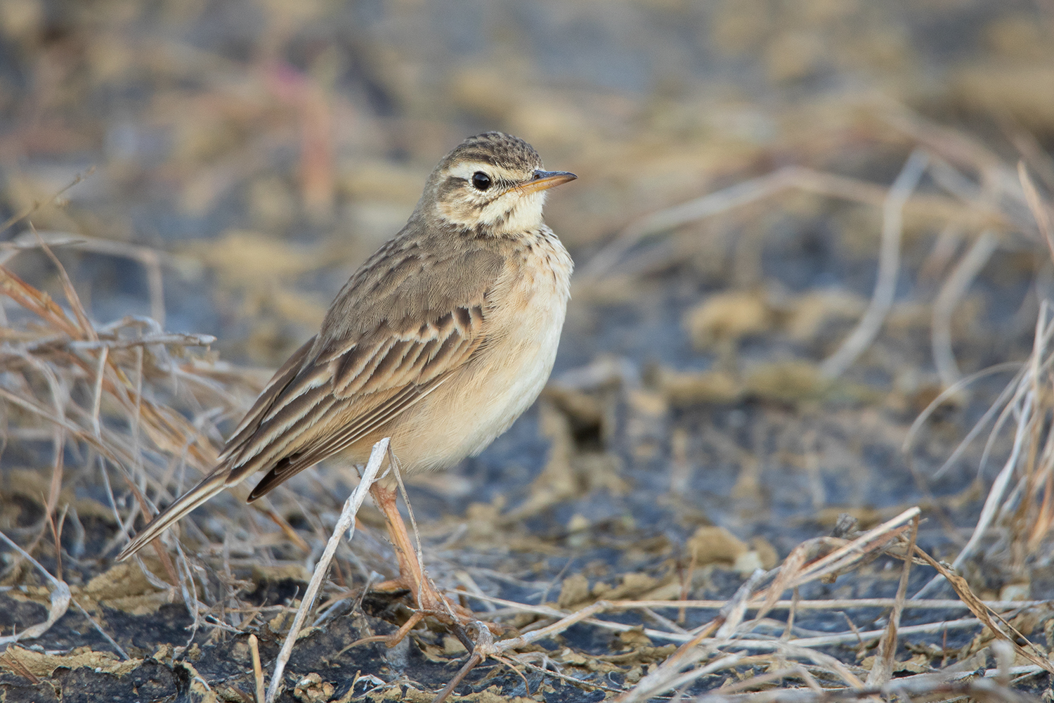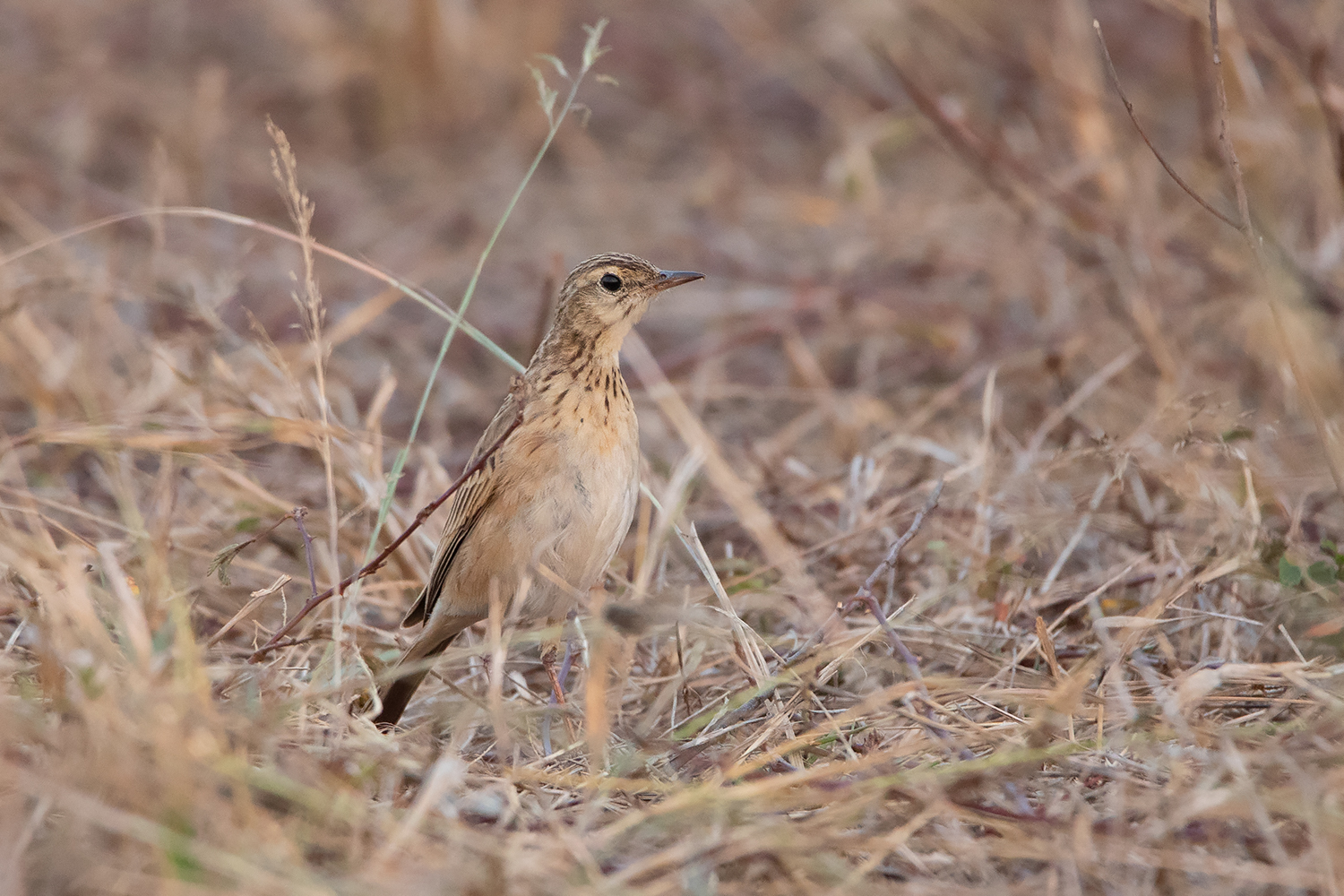 Let’s start with the classic look of the Paddyfield Pipit. When seen in the field, it often appears rather compact with short tail and rather large head. It also usually appears noticeably smaller than the Richard’s Pipit, although the race sinensis of Richard’s Pipit might not differ in size. The hind claws of Paddyfield Pipit are also shorter than in Richard’s Pipit, but not much different from Blyth’s Pipit. Again, the most diagnostic feature that I find useful for separating these two similar species is the bill. Paddyfield Pipit has a long and narrow bill with fine bill tip, and the culmen is not noticeably curved as in Richard’s Pipit. Another feature that is often useful is the lore colour. In Paddyfield Pipit, the lore usually appears darker than in Richard’s and Blyth’s Pipit. However, some Paddyfield Pipits can also have rather pale lores, while both Richard’s and Blyth’s Pipit might appear to have dark lores too, especially when seen in profile or while moulting. It is important to pay attention to several features and not relying on a single characteristic when trying to identify them.