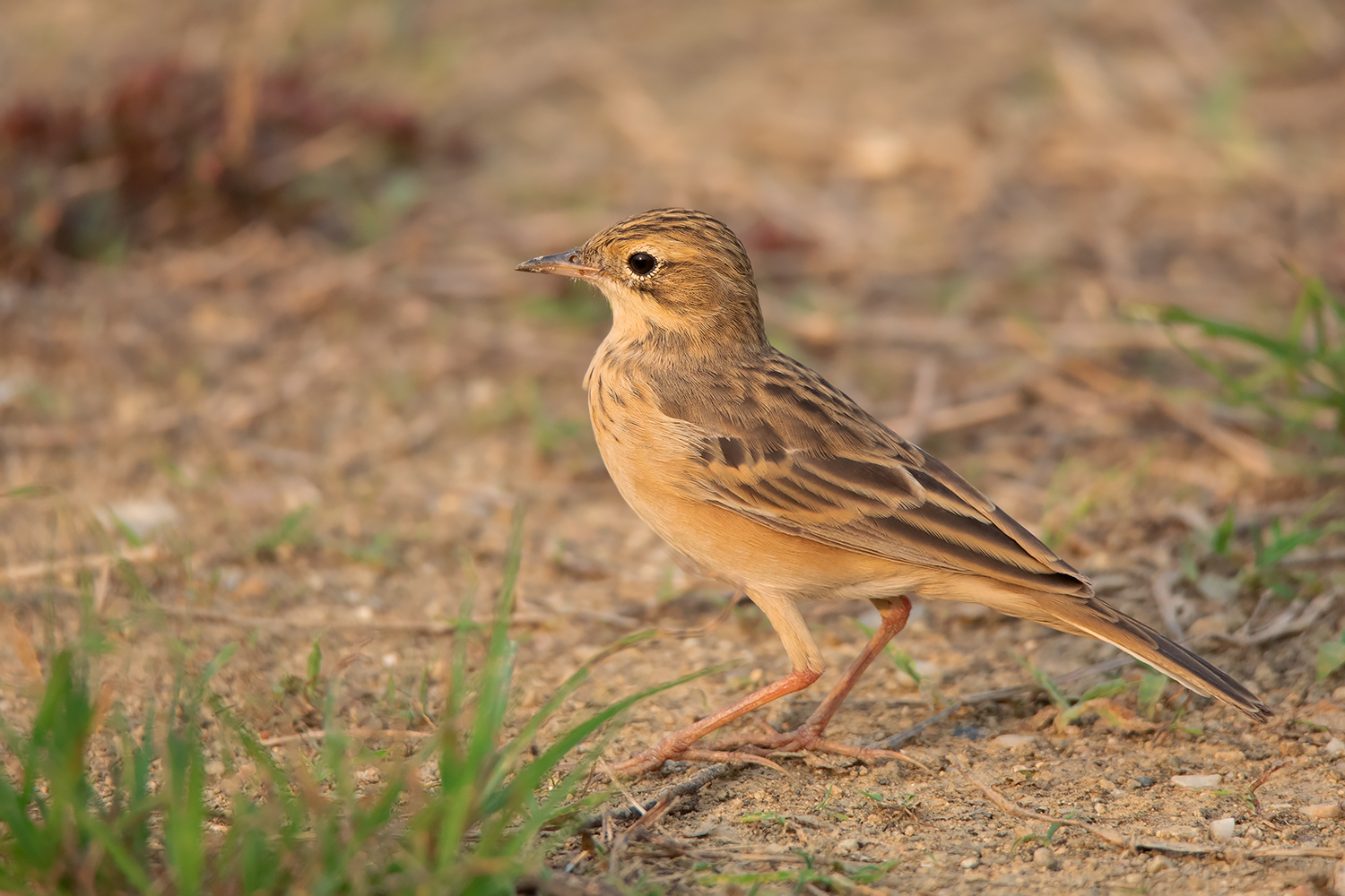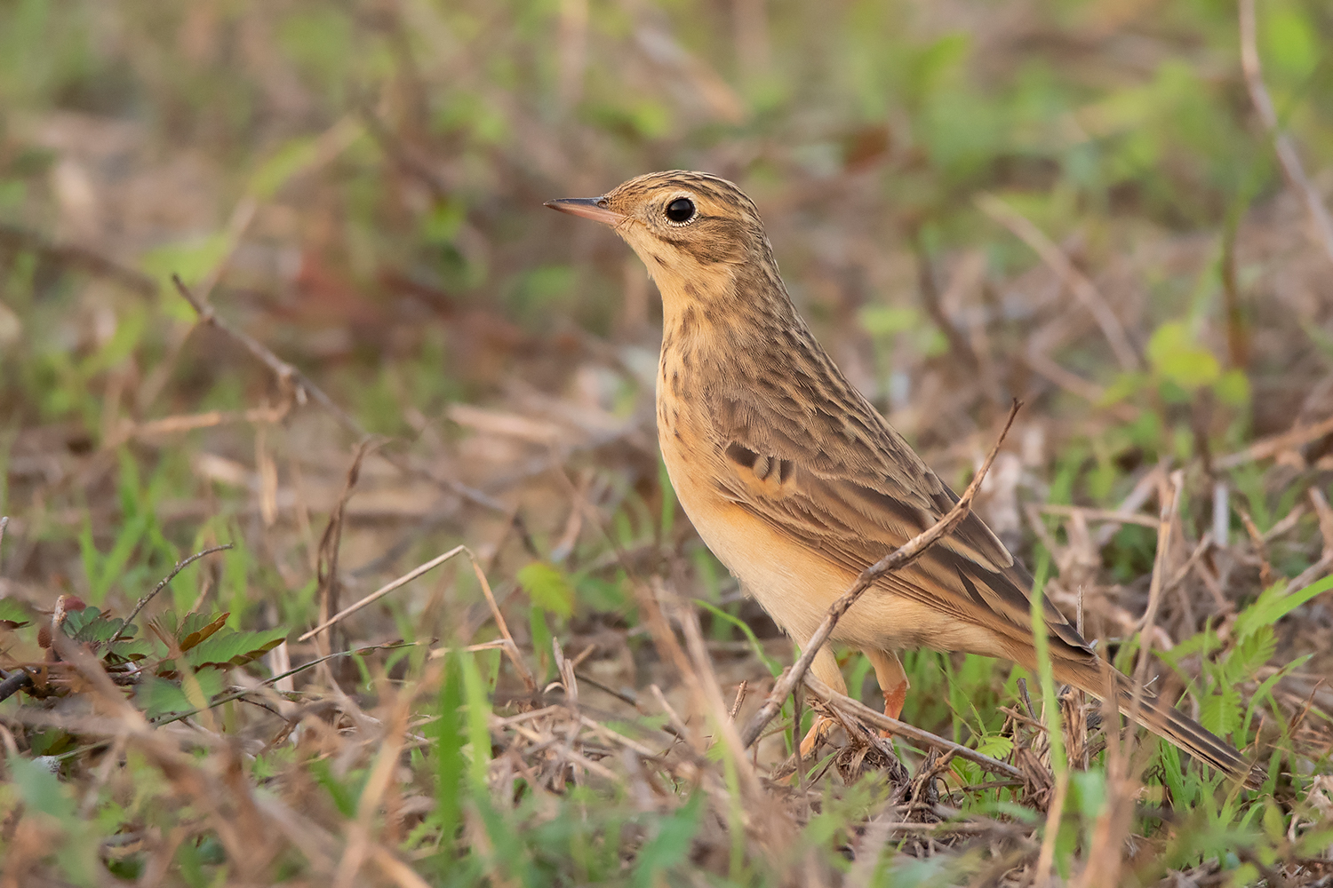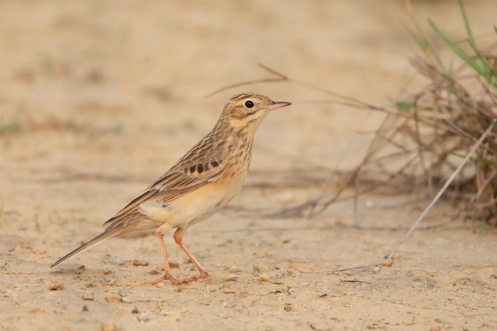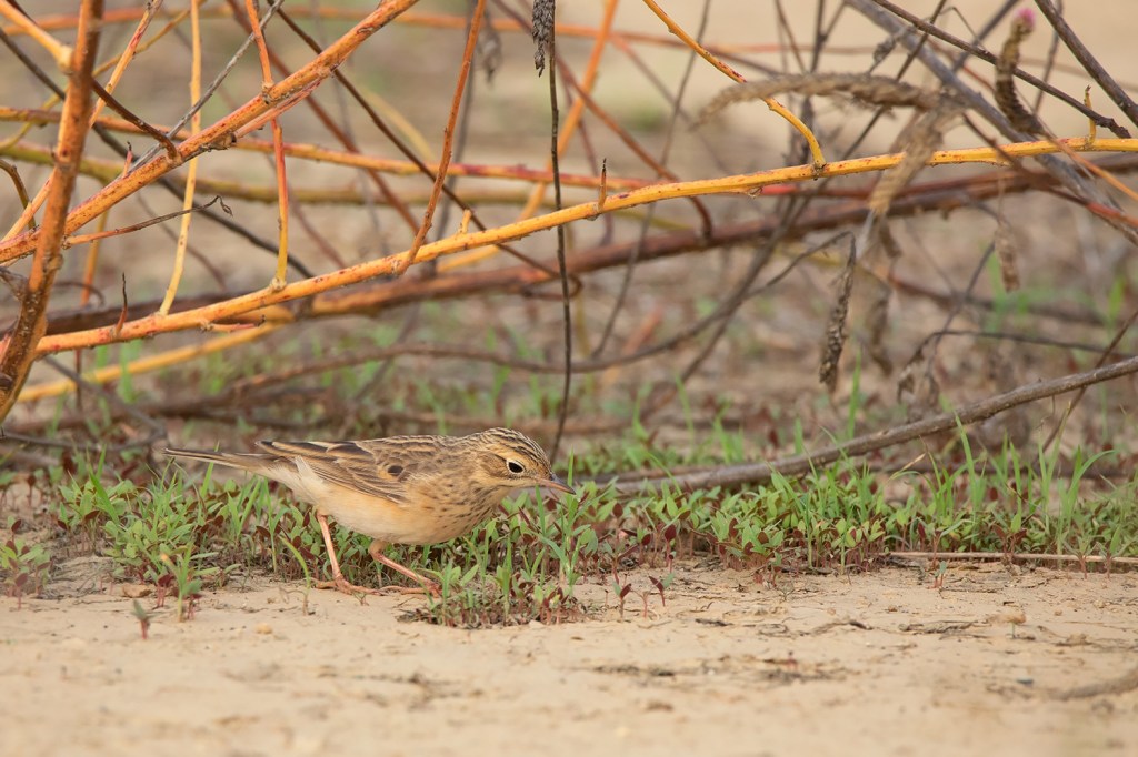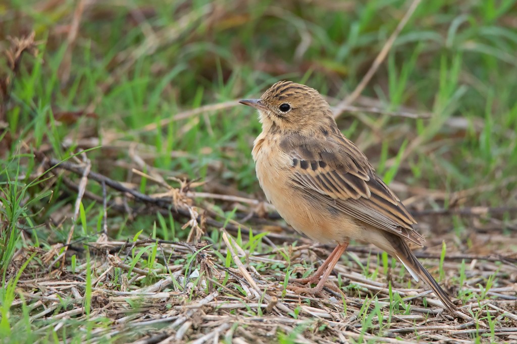 Classic posture of Blyth’s Pipit; note the fine small bill, short tail, short legs and short hind claws. This individual already attained most of the adult feathers including the median coverts which show more square-shaped dark centres unlike in Richard’s and Paddyfield Pipit. (Date 23 April 2021)