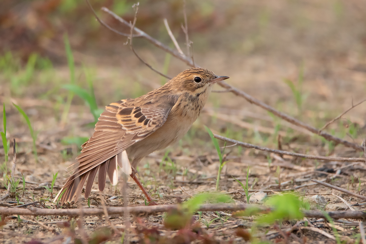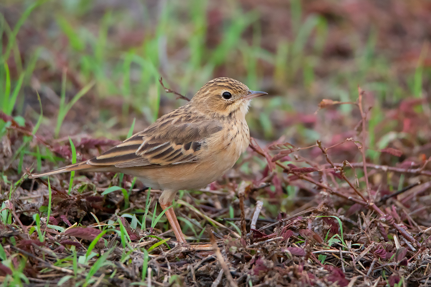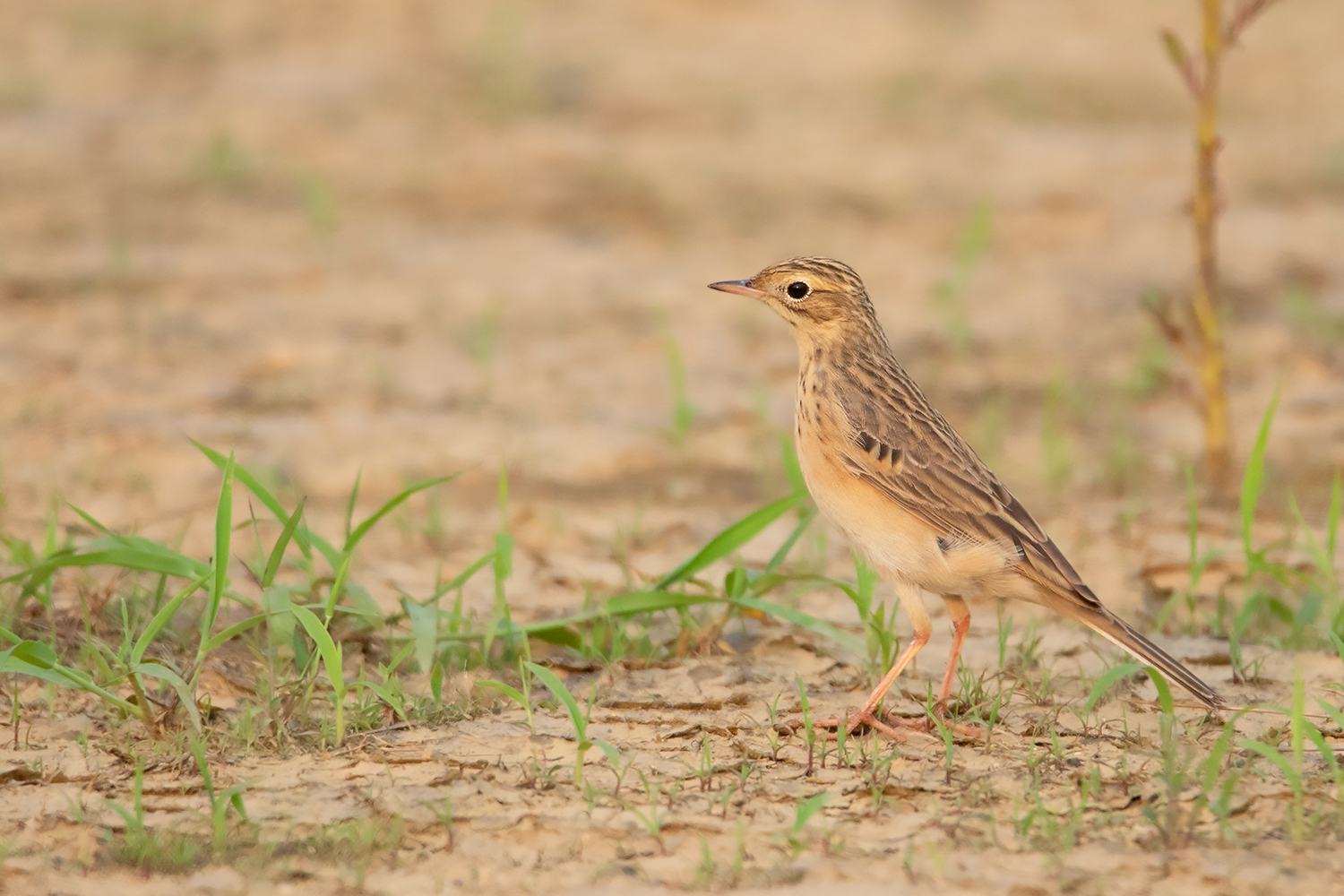 Classic posture of Blyth’s Pipit; note the fine small bill, short tail, short legs and short hind claws. This individual already attained most of the adult feathers including the median coverts which show more square-shaped dark centres unlike in Richard’s and Paddyfield Pipit. (Date 23 April 2021)