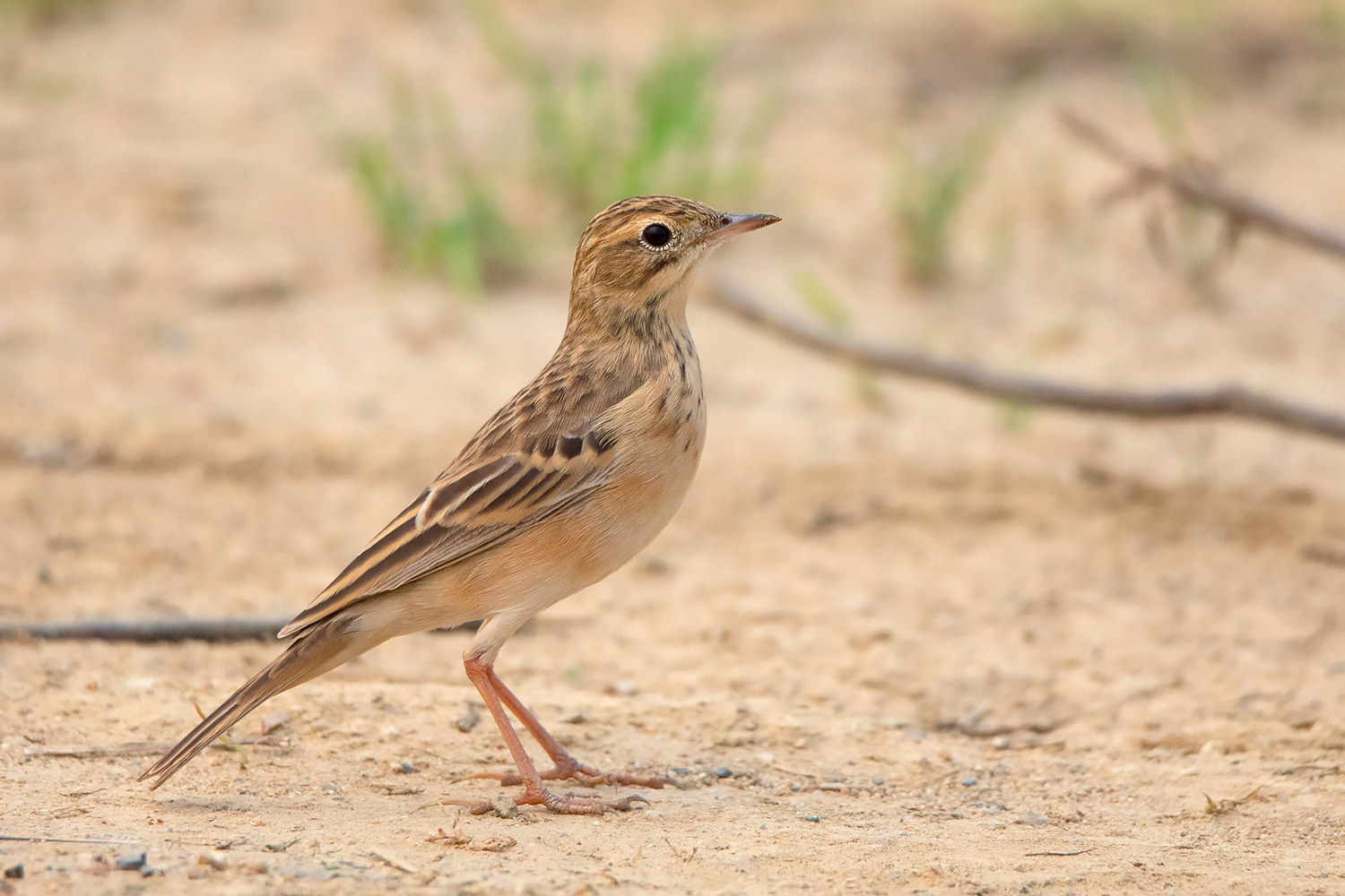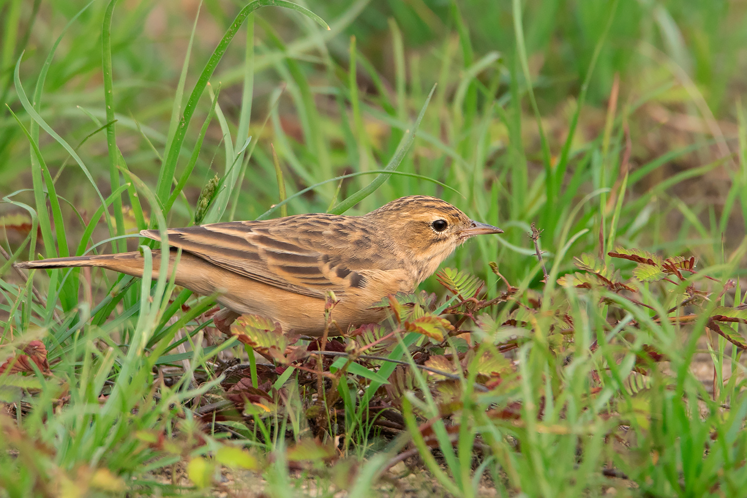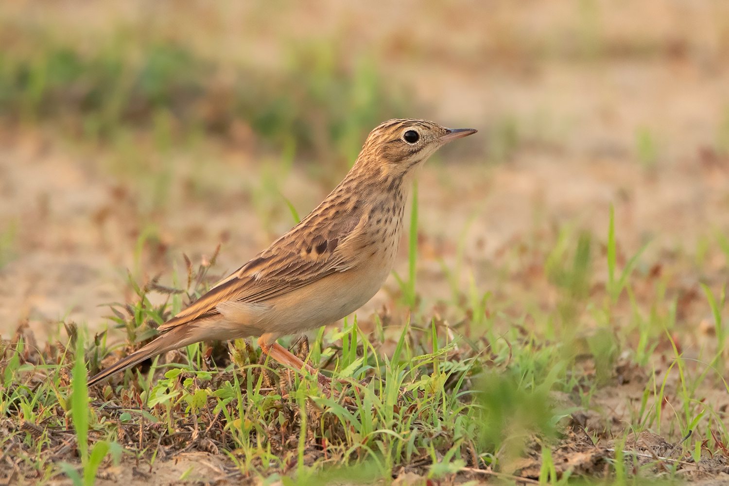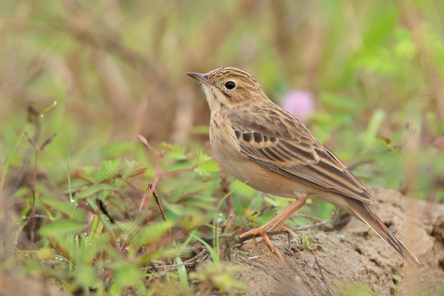 Classic posture of Blyth’s Pipit; note the fine small bill, short tail, short legs and short hind claws. This individual already attained most of the adult feathers including the median coverts which show more square-shaped dark centres unlike in Richard’s and Paddyfield Pipit. (Date 23 April 2021)