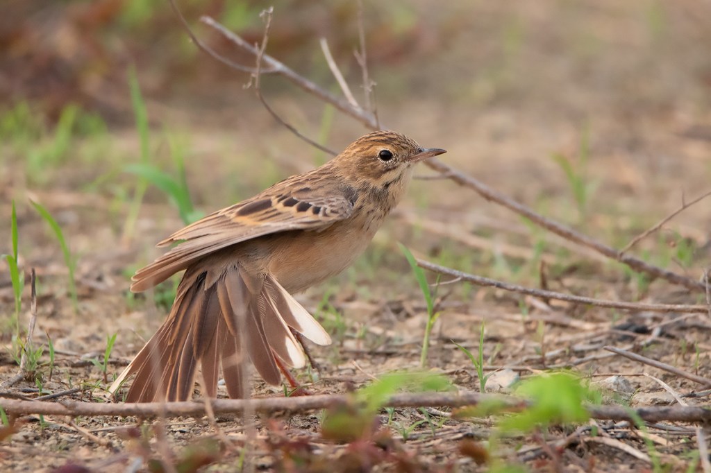 Another diagnostic feature of Blyth’s Pipit is the tail pattern. The second outermost pair of tail feathers has a very small white patch at the tip. In Richard’s and Paddyfield Pipit, the second outermost tail feathers are nearly all white, similar to the outermost tail feathers. (Date 21 April 2021)