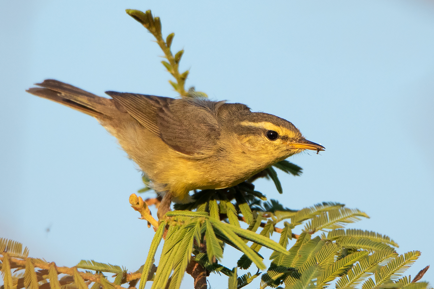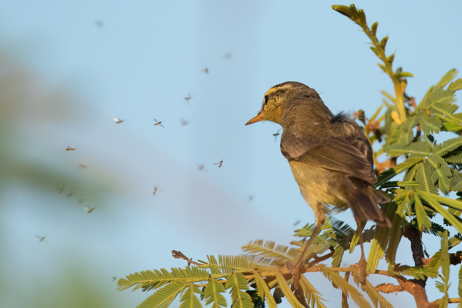 After my first encounter, I visited the site almost daily to observe it. The bird proved to be very territorial. It spent most of the time foraging in a small area of mimosa trees surrounded by a paved road. It sometimes flew over a short brick wall to feed in a larger area of mimosa trees on the southern side, but usually returned to its main territory within less than an hour. It was quite clear that the main reason for it to stay in such a small territory was the abundance of food. There seemed to be some sort of insects that emerged from the mimosa trees daily in the evening around 5 PM onward. To me, they looked like flying ants but I really can’t be sure. Once these insects came out, the bird became very easy to approach and photograph.