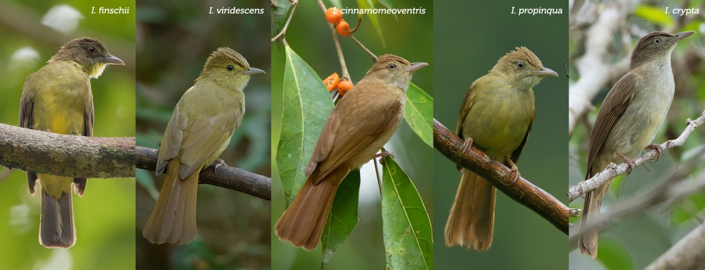 Let’s go through the members of this genus one by one. The first species is actually a rather new member to this genus, the Finsch’s Bulbul (Iole finschii). Originally, it was placed within either genus Criniger or Alophoixus, but the current version of most checklists including the IOC and HBW Checklist, place it within the genus Iole. Despite looking very different from other Iole bulbuls, it actually has a similar type of call to other members of the genus. The call of Finsch’s Bulbul can be listened here. Plumage-wise, it has a distinct yellow wash on the underparts with a distinctive yellow puffy throat different from other species. The bill is also thicker than other Iole bulbuls making it the easiest member of this genus to identify. In Thailand, it can only be found in the southernmost part of the country along the Thai-Malay border.