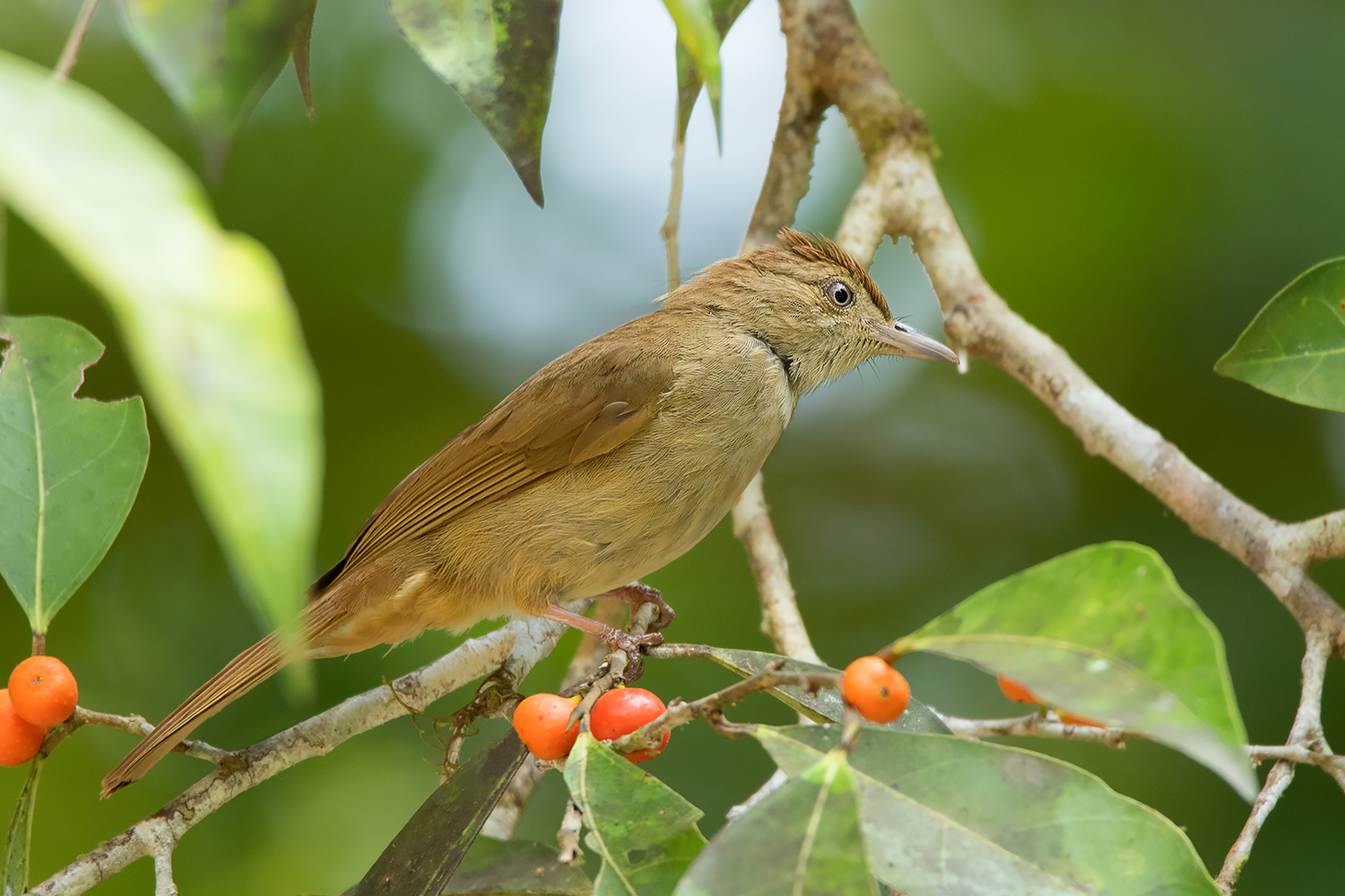 The last member of the genus is the Buff-vented Bulbul (I. crypta). It can be found only in the south where it overlaps with Baker’s Bulbul. It can be quite challenging to identify these two. Compared to Baker’s Bulbul, the Buff-vented Bulbul usually appears much less yellowish, especially on the underparts. The undertail coverts lack the rufous tinge as in Baker’s Bulbul, and often show a darker brown centre to each feather. The bill is also larger than in Baker’s, Olive and Grey-eyed Bulbul. The call is also similar to Baker’s Bulbul and can only be identified in the field with trained ears https://www.xeno-canto.org/336935.