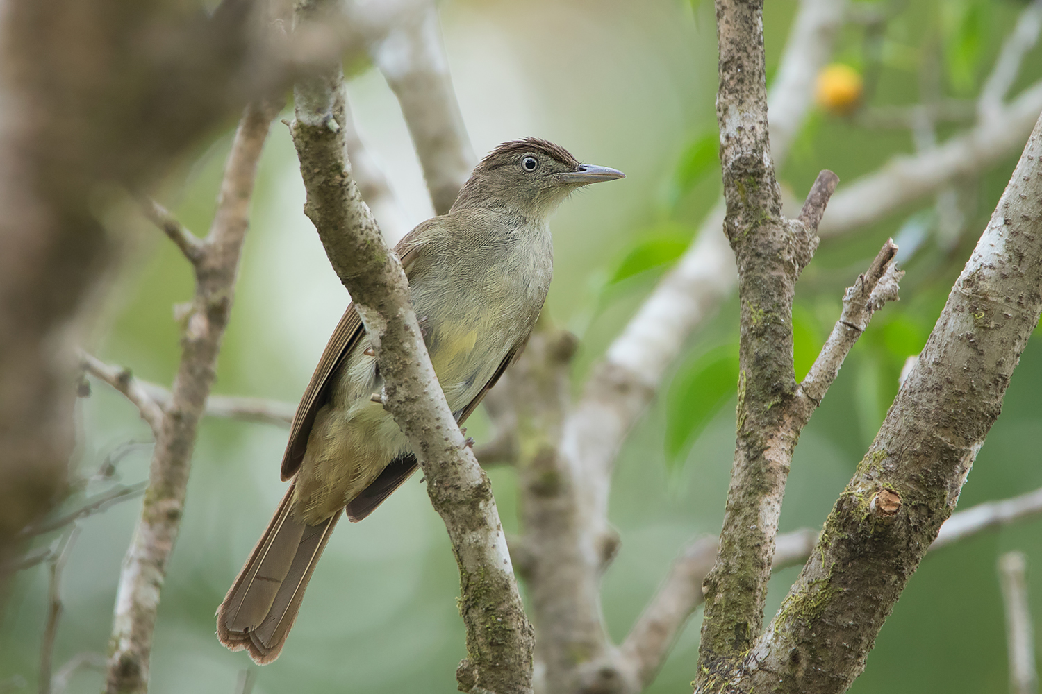 The next species is the Grey-eyed Bulbul (I. propinqua). It is the default Iole bulbul when birding in the north, north-east and south-eastern Thailand. The race lekhakuni which is described to be found in the west is suggested to be a doubtfully recognisable subspecies of Olive Bulbul. Basically, the plumage of Grey-eyed Bulbul is probably unidentifiable from Baker’s Bulbul in the field (slightly more yellowish overall), but they have no overlap in the distribution. It can sometimes appear yellowish like Olive Bulbul but the iris is quite consistently pale brownish-grey. The best way to separate Grey-eyed from other Iole bulbuls is actually by the call. Grey-eyed Bulbul has a much flatter call compared to other species. The call of Grey-eyed Bulbul can be listened here https://www.xeno-canto.org/336887.