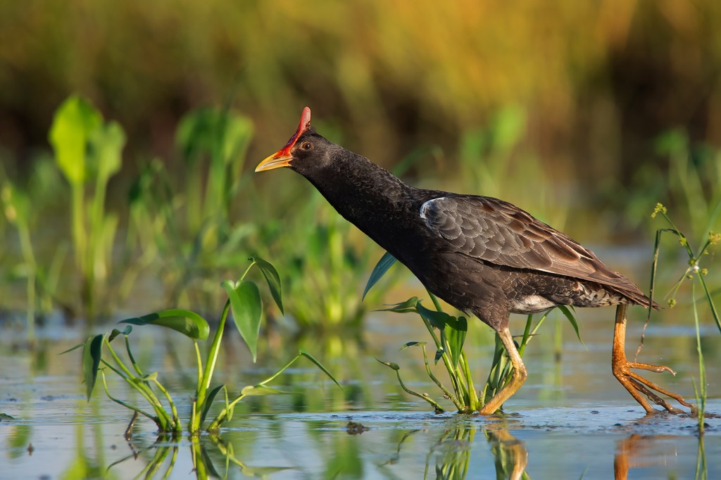I like to photograph the Watercocks in old/abandoned rice fields as the photos generally look more natural with the plant diversity. Here you can see at least 3 species of plants including the native Monochoria hastata (Hastate-leaved Pondweed) in the foreground and the alien Eichhornia crassipes (Common Water Hyacinth) in the background with some possibly Cyperus sp. on the right.