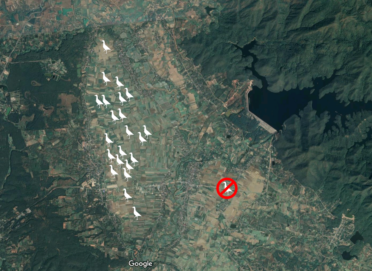 The map above shows the territory/presence of different male Watercocks that I’d observed throughout July. It was really interesting to find out such a strong contrast between the abundance of Watercocks in Inthakin paddies (large plains on the left) versus the complete lack in Cho Lae paddies (smaller plains on the right). I remember that Watercocks used to be fairly common in Cho Lae paddies some 10 years ago, but despite my effort in exploring the area, I didn’t see or hear any. One thing that I noticed was the difference between the farming process in Inthakin and Cho Lae paddies. Lately, rice fields in Cho Lae seemed to be managed at a large scale meaning that the whole area was ploughed roughly at the same time, planted with rice seedlings at the same time, and harvested around the same time. On the other hand, rice fields in Inthakin appeared to be managed in different smaller sectors. Timing of the farming process is different between each sector making the overall habitat more diverse than in Cho Lae. I think that habitat diversity might be the key factor that affects the population of Watercocks in this area.
