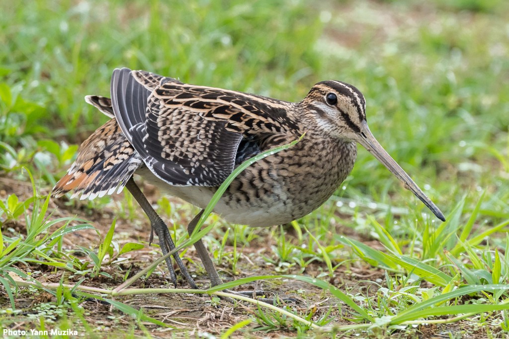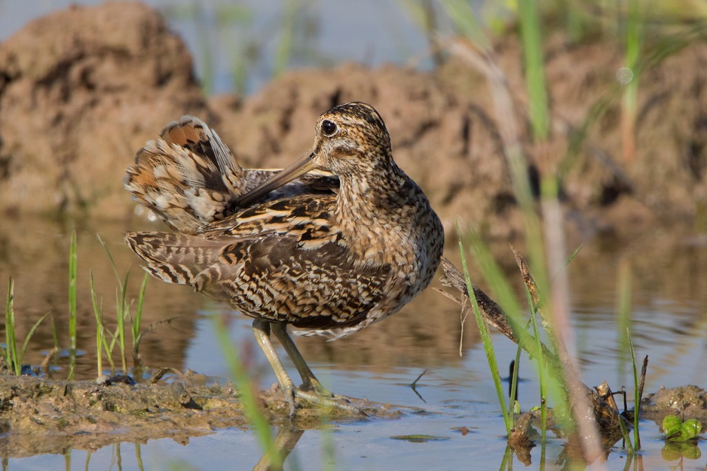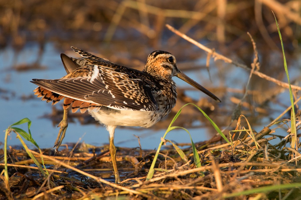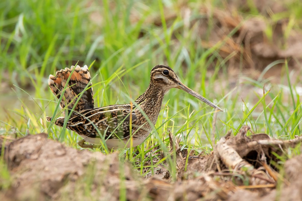 As the name suggests, the most diagnostic feature of the Pin-tailed Snipe is the tail, more specifically the outer tail feathers which are extremely narrow and pin-like. The best way to identify Pin-tailed and Swinhoe’s Snipe is by judging the width of these outer tail feathers. This can be done quite easily when examining the birds in hand, but in the field, you would need to see them up close while they’re either preening or sunbathing or obtain good photos of the spread tail while landing. I usually spend several hours observing them in the field only to get glimpses of the outer tail feathers. I find early morning to be the best time to observe them, particularly a sunny morning after a rainy night, as the birds would be rather wet and spend a lot of time sunning and preening themselves which offers a higher chance of seeing the outer tail feathers.