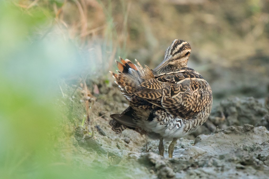 Another diagnostic feature of the Common Snipe is the tail feathers. Unlike in Swintail Snipe, the tail feathers of Common Snipe are all equally broad. Its Thai name นกปากซ่อมหางพัด literally means “fan-tailed snipe” because of this characteristic. However, to see the spread tail usually requires a lot of effort as it is only shown when the bird is stretching, preening, landing or when performing the alert/defensive posture.