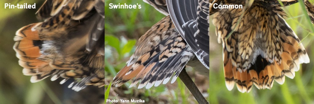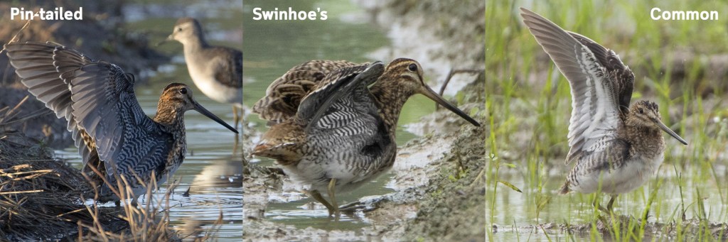 In flight, Pin-tailed Snipe can be told from the Common Snipe by having heavily and evenly barred underwing coverts with no bold white trailing edge along the secondaries. However, both Pin-tailed and Swinhoe’s Snipe share the same wing pattern, so they can’t be judged by this characteristic.