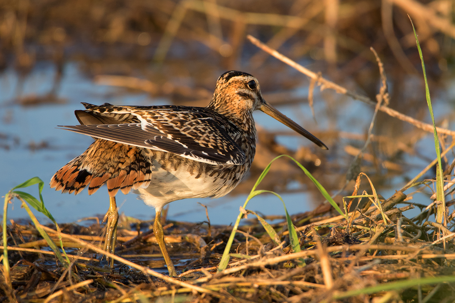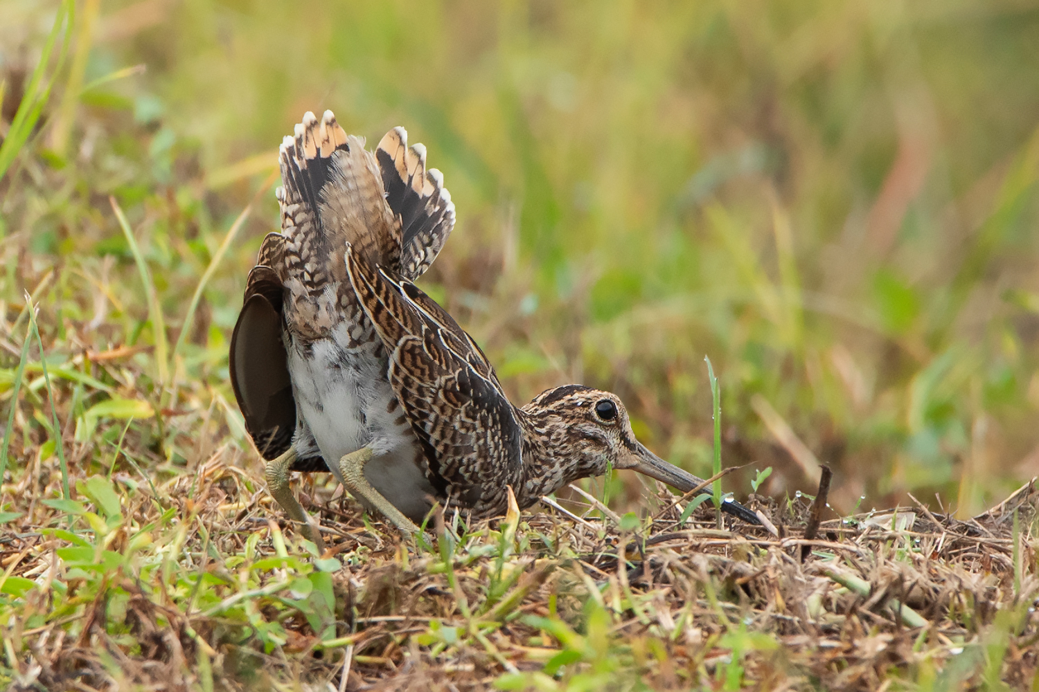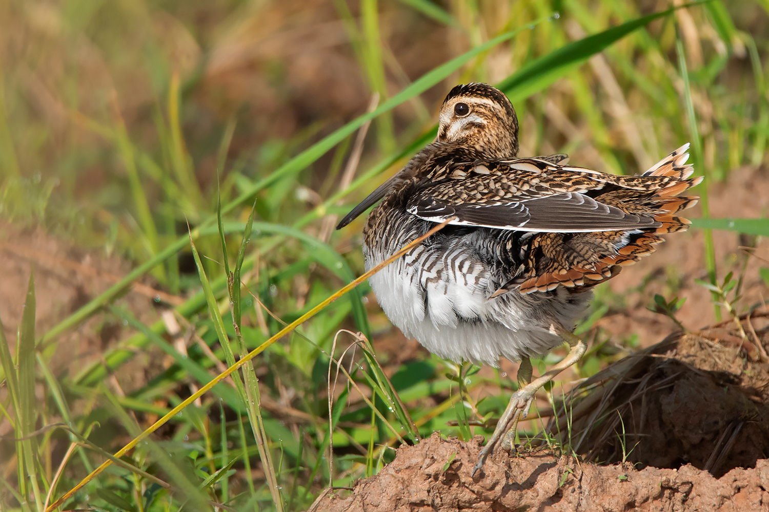 As the name suggests, the most diagnostic feature of the Pin-tailed Snipe is the tail, more specifically the outer tail feathers which are extremely narrow and pin-like. The best way to identify Pin-tailed and Swinhoe’s Snipe is by judging the width of these outer tail feathers. This can be done quite easily when examining the birds in hand, but in the field, you would need to see them up close while they’re either preening or sunbathing or obtain good photos of the spread tail while landing. I usually spend several hours observing them in the field only to get glimpses of the outer tail feathers. I find early morning to be the best time to observe them, particularly a sunny morning after a rainy night, as the birds would be rather wet and spend a lot of time sunning and preening themselves which offers a higher chance of seeing the outer tail feathers.