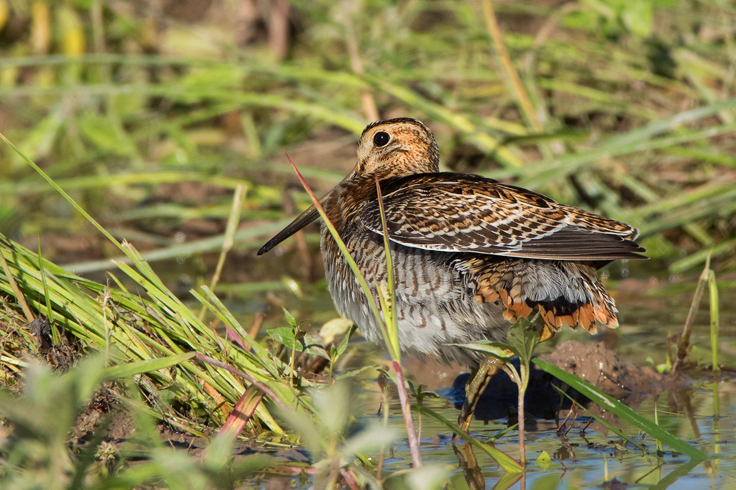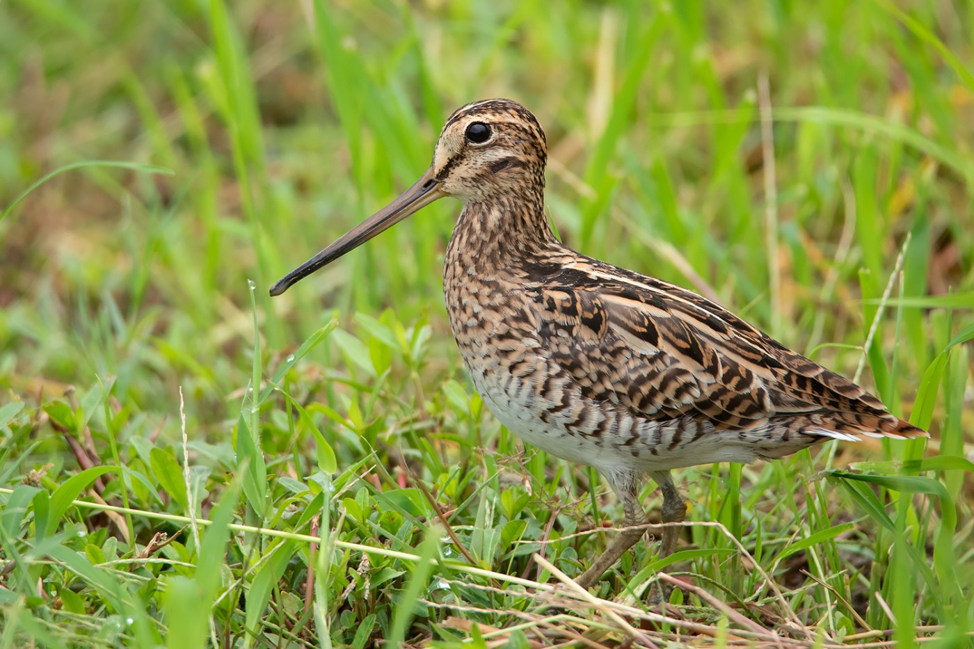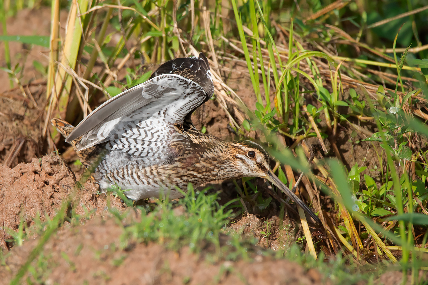 As the name suggests, the most diagnostic feature of the Pin-tailed Snipe is the tail, more specifically the outer tail feathers which are extremely narrow and pin-like. The best way to identify Pin-tailed and Swinhoe’s Snipe is by judging the width of these outer tail feathers. This can be done quite easily when examining the birds in hand, but in the field, you would need to see them up close while they’re either preening or sunbathing or obtain good photos of the spread tail while landing. I usually spend several hours observing them in the field only to get glimpses of the outer tail feathers. I find early morning to be the best time to observe them, particularly a sunny morning after a rainy night, as the birds would be rather wet and spend a lot of time sunning and preening themselves which offers a higher chance of seeing the outer tail feathers.