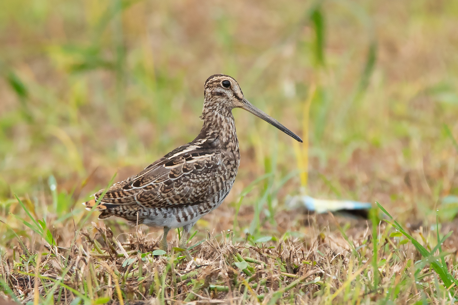 It is probably easiest to identify the Common Snipe while in flight. The underwings of Common Snipe are much different from both Pin-tailed and Swinhoe’s Snipe by having more extensive amount of white on the barring of underwing coverts. The upperwings are also different by having a bold white trailing edge along the secondaries which can be seen clearly particularly when landing. Both Pin-tailed and Swinhoe’s Snipe lack such bold white trailing edge. However, the amount of white on the underwing coverts can be quite variable ranging from completely white to very little white with extensive dark barring just like in Pin-tailed and Swinhoe’s Snipe, but the white trailing edge along the secondaries seems to be consistent among all birds that I’ve photographed.