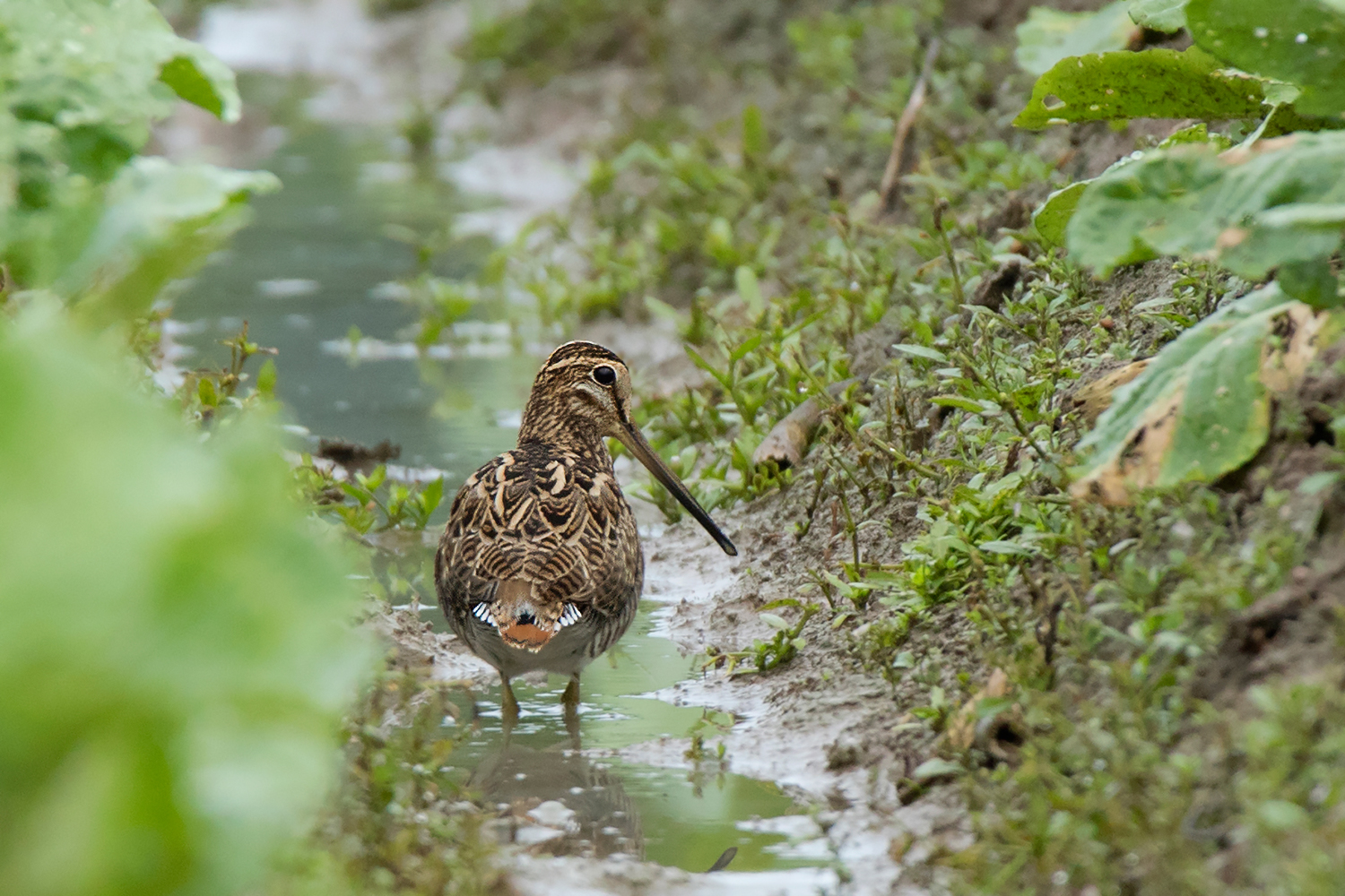 Another diagnostic feature of the Common Snipe is the tail feathers. Unlike in Swintail Snipe, the tail feathers of Common Snipe are all equally broad. Its Thai name นกปากซ่อมหางพัด literally means “fan-tailed snipe” because of this characteristic. However, to see the spread tail usually requires a lot of effort as it is only shown when the bird is stretching, preening, landing or when performing the alert/defensive posture.