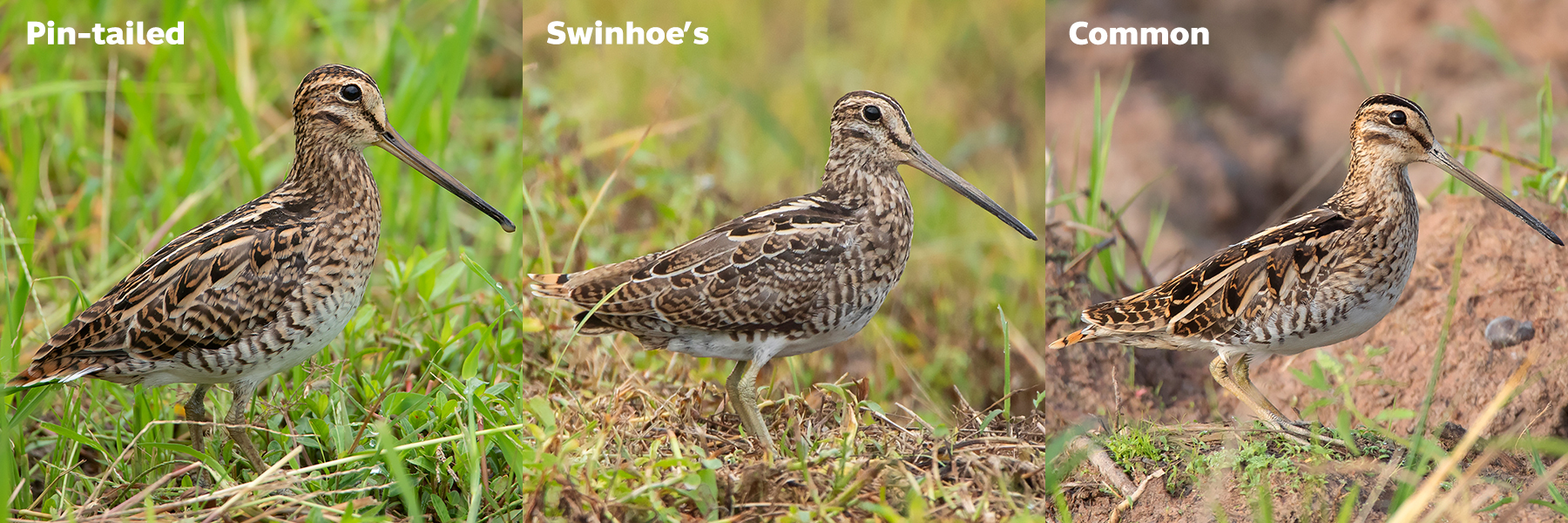 The three species that will be discussed in this post are 1) Pin-tailed Snipe, 2) Swinhoe’s Snipe, and 3) Common Snipe. All three species are non-breeding migrants in Thailand with Pin-tailed and Common Snipe being common and widespread throughout the country, while Swinhoe’s Snipe is extremely rare and possibly largely overlooked. Field identification of Common Snipe from ‘Swintail’ (Swinhoe’s/Pin-tailed) Snipe is quite straightforward, but to identify Swinhoe’s from Pin-tailed Snipe requires much more effort and good photographic evidence.