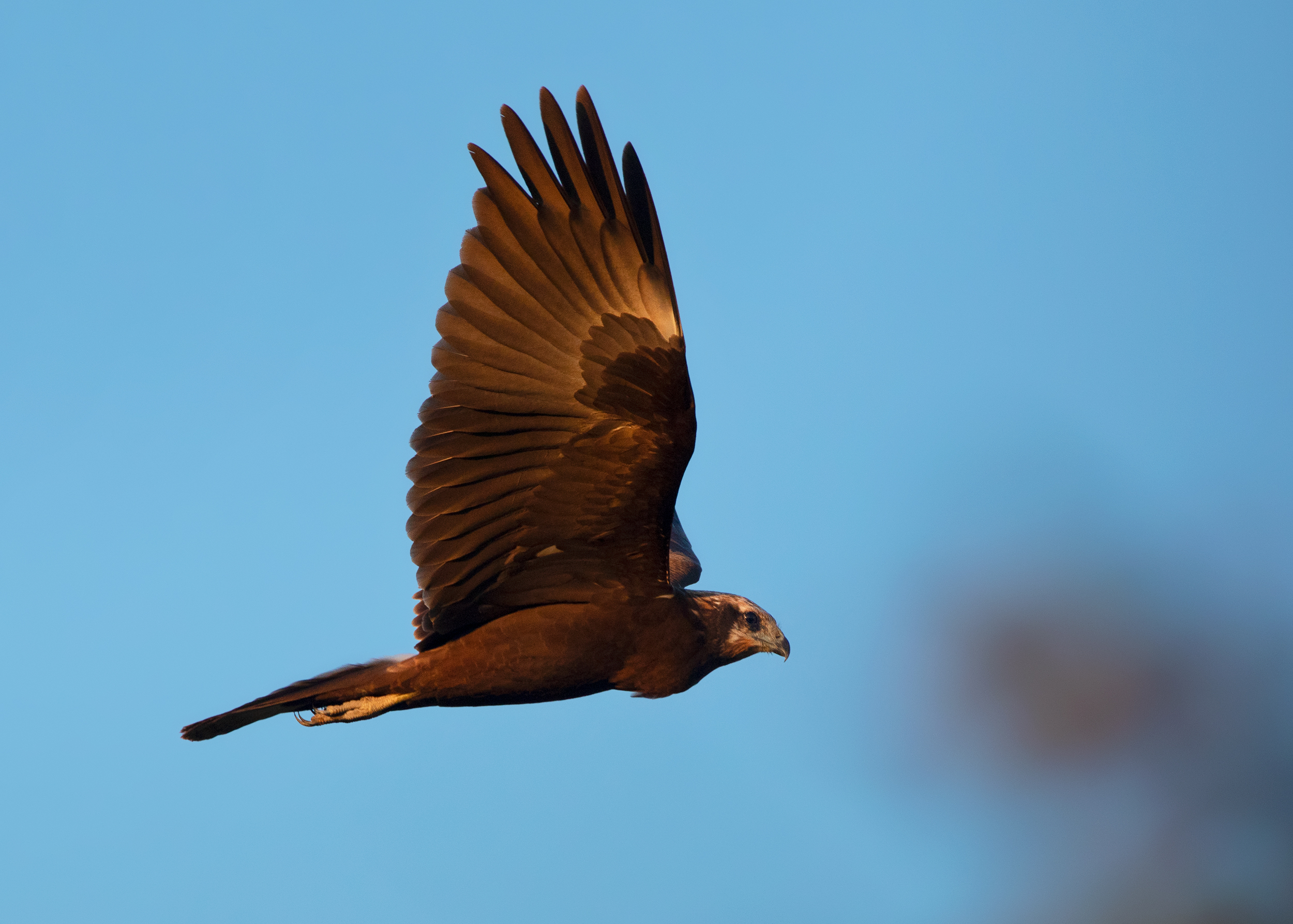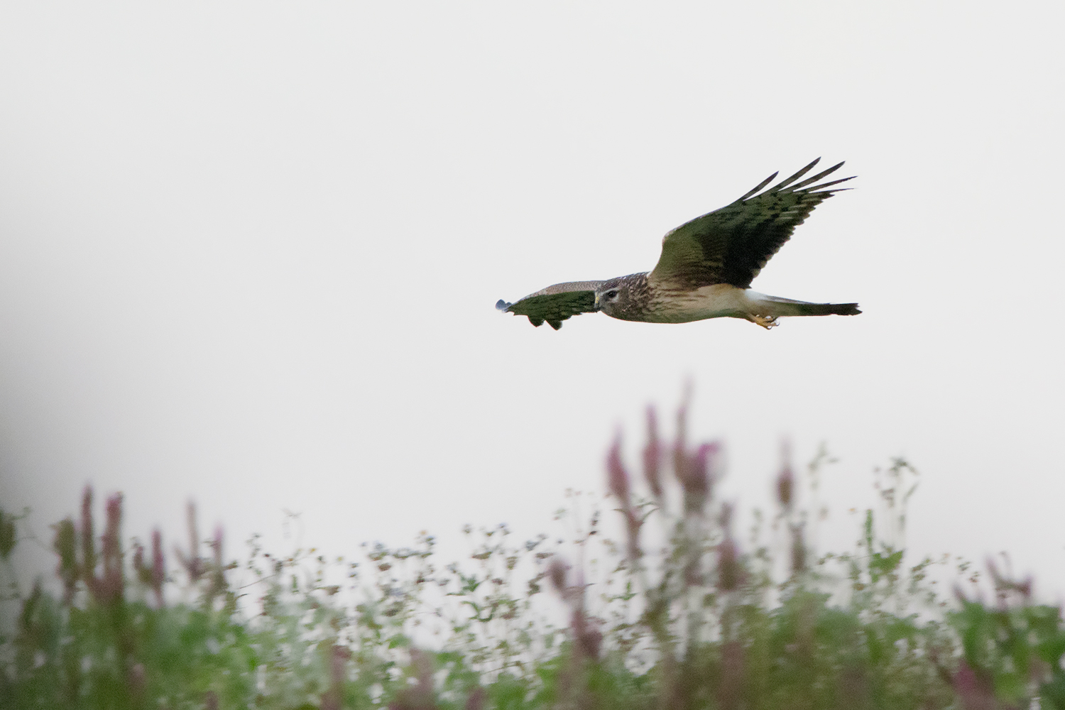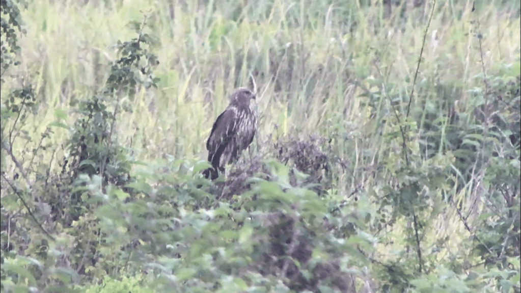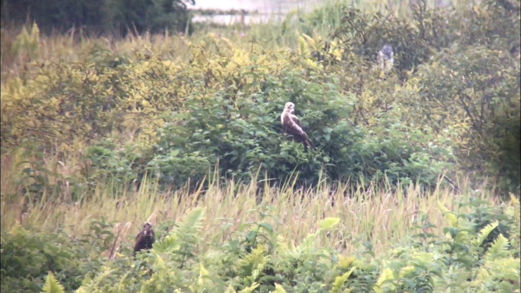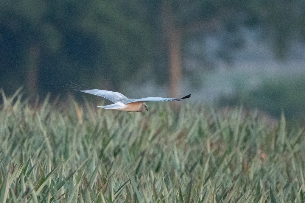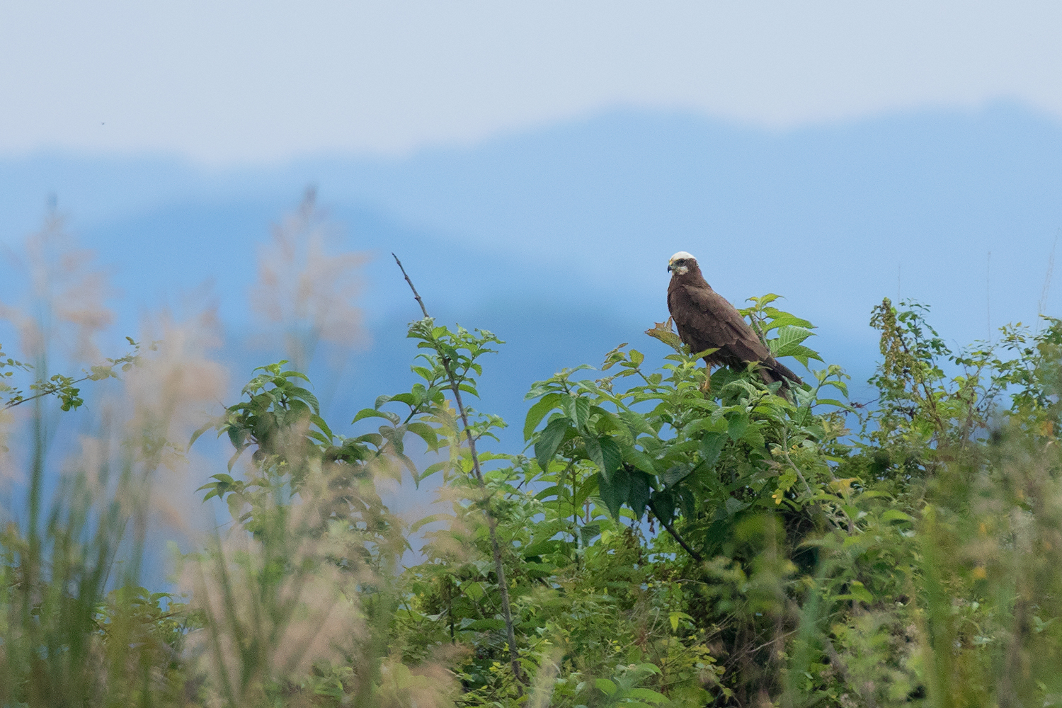 Unlike Pied Harriers, the Eastern Marsh Harriers usually land on shrubs and treetops separately across the floating grassland. They like to sit in the open for a long while before dropping into the denser cover when it gets nearly dark. The best way to observe perching Eastern Marsh Harriers is by using a telescope to scan across the floating grassland from a higher angle like from the watch tower or on the nearby hill.