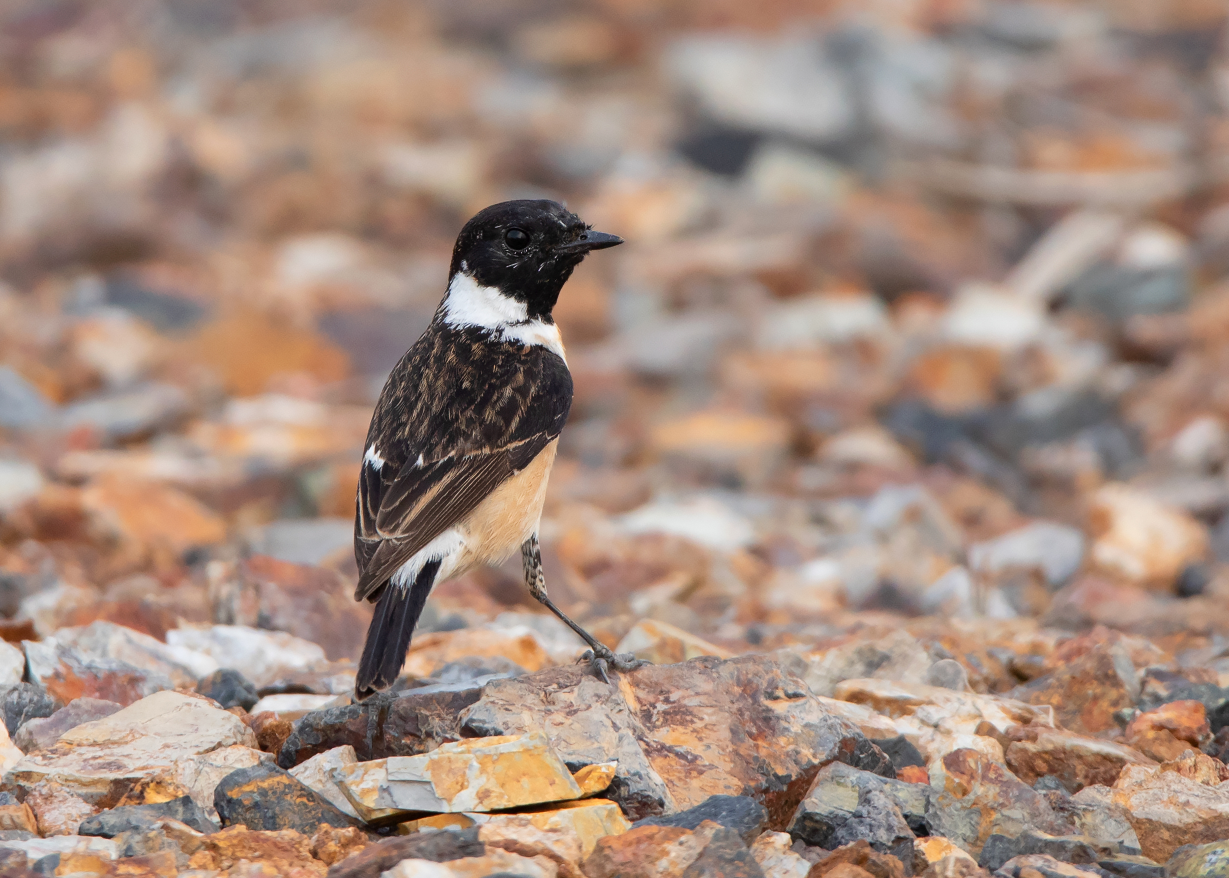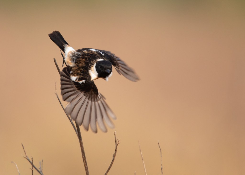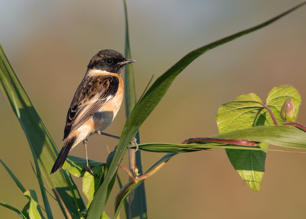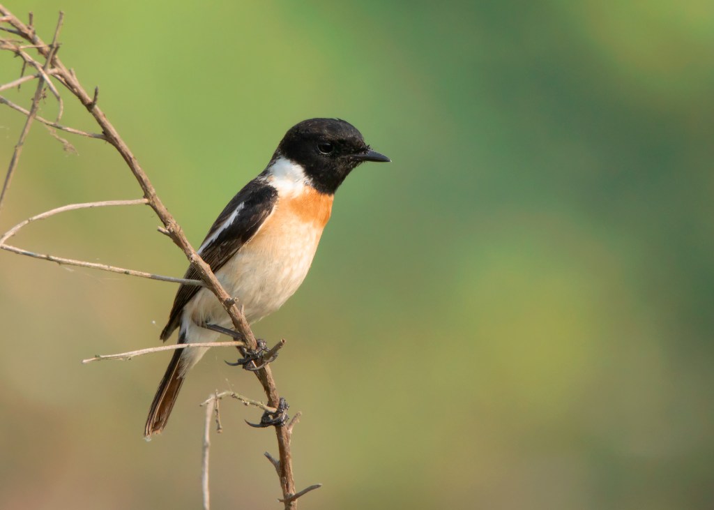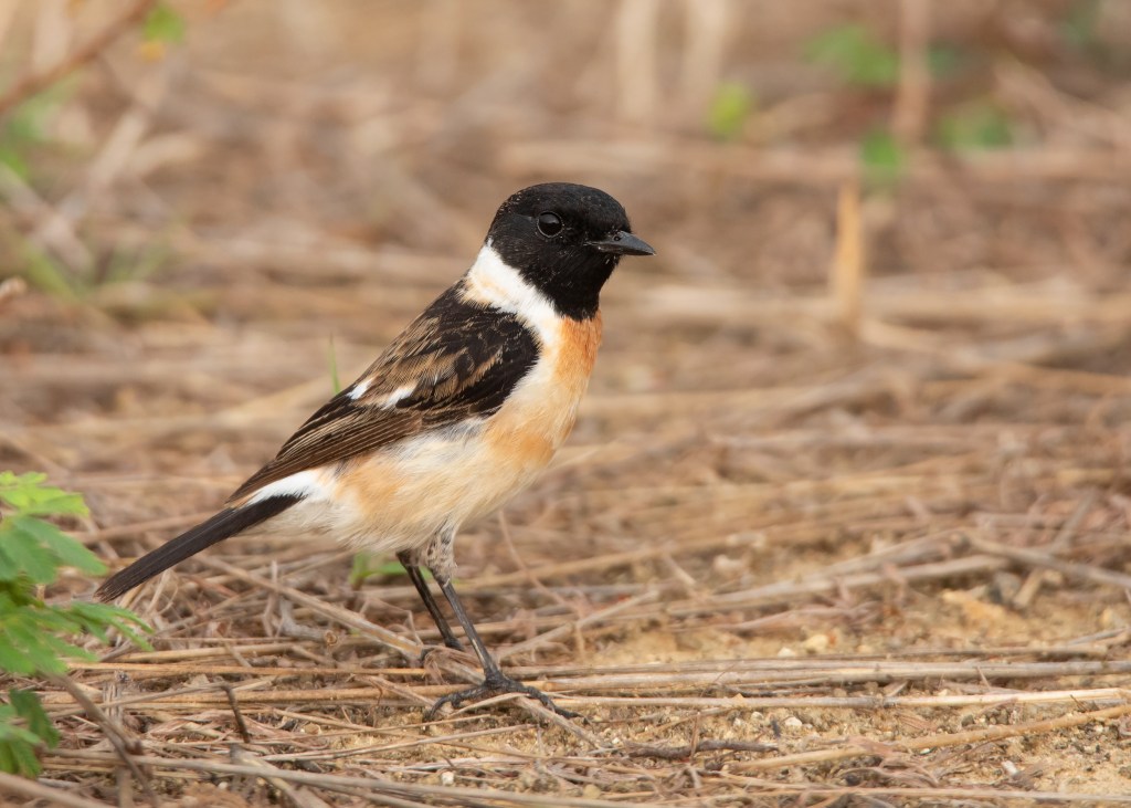 Let’s start with the description of Amur Stonechat. According to a study by Magnus Hellström and Gabriel Norevik published in British Birds 107, it is said that the male Amur Stonechat in spring generally shows a slightly smaller white rump area, more restricted white neck patches and, on average, a broader bill than the nominate Siberian Stonechat. The authors also mention observing birds that were passing through Beidaihe in northeast China to be somewhat uniform, typically with a small white rump and neck patches as well as being extensively washed rufous on the belly and flanks.