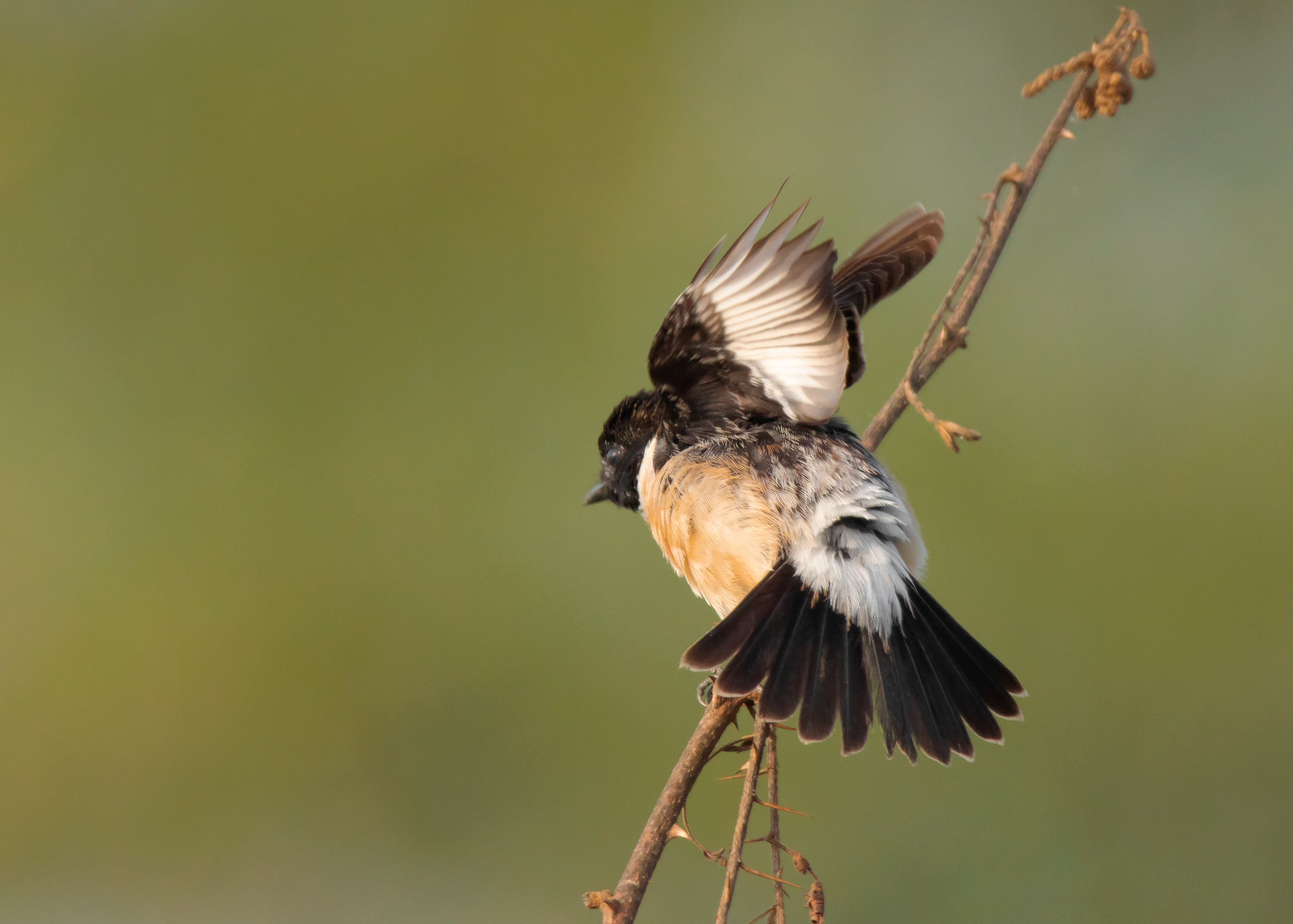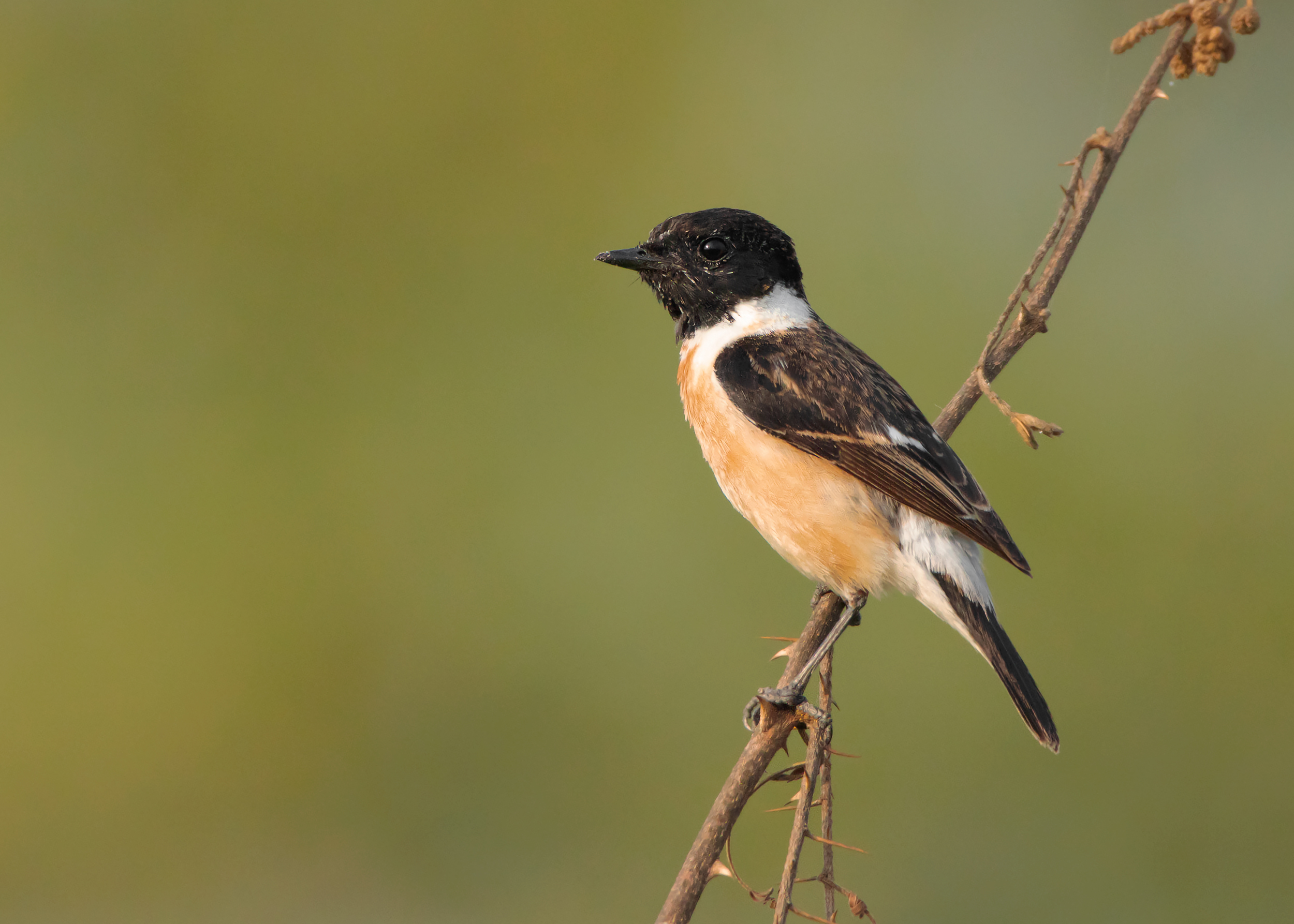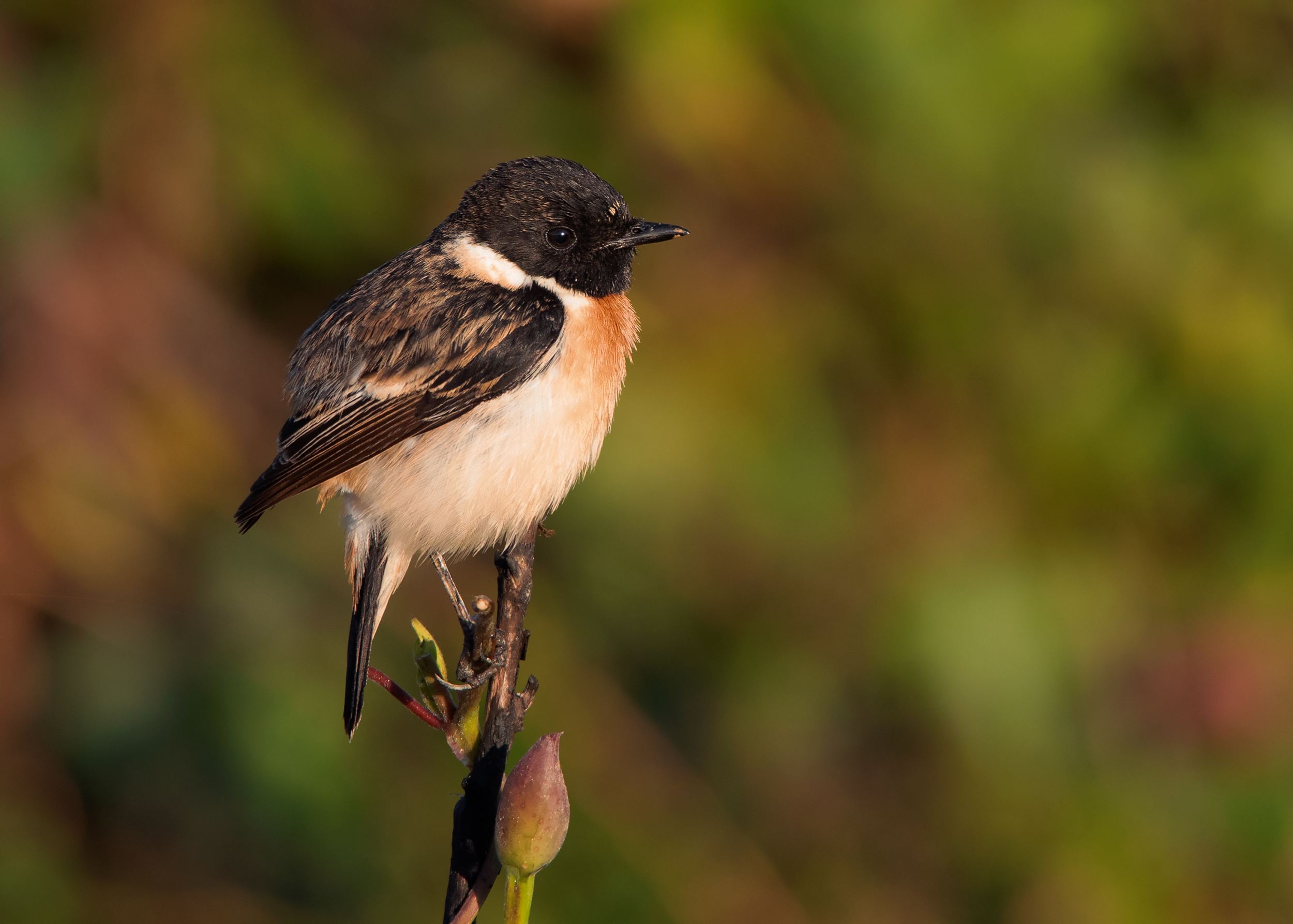 Let’s start with the description of Amur Stonechat. According to a study by Magnus Hellström and Gabriel Norevik published in British Birds 107, it is said that the male Amur Stonechat in spring generally shows a slightly smaller white rump area, more restricted white neck patches and, on average, a broader bill than the nominate Siberian Stonechat. The authors also mention observing birds that were passing through Beidaihe in northeast China to be somewhat uniform, typically with a small white rump and neck patches as well as being extensively washed rufous on the belly and flanks.