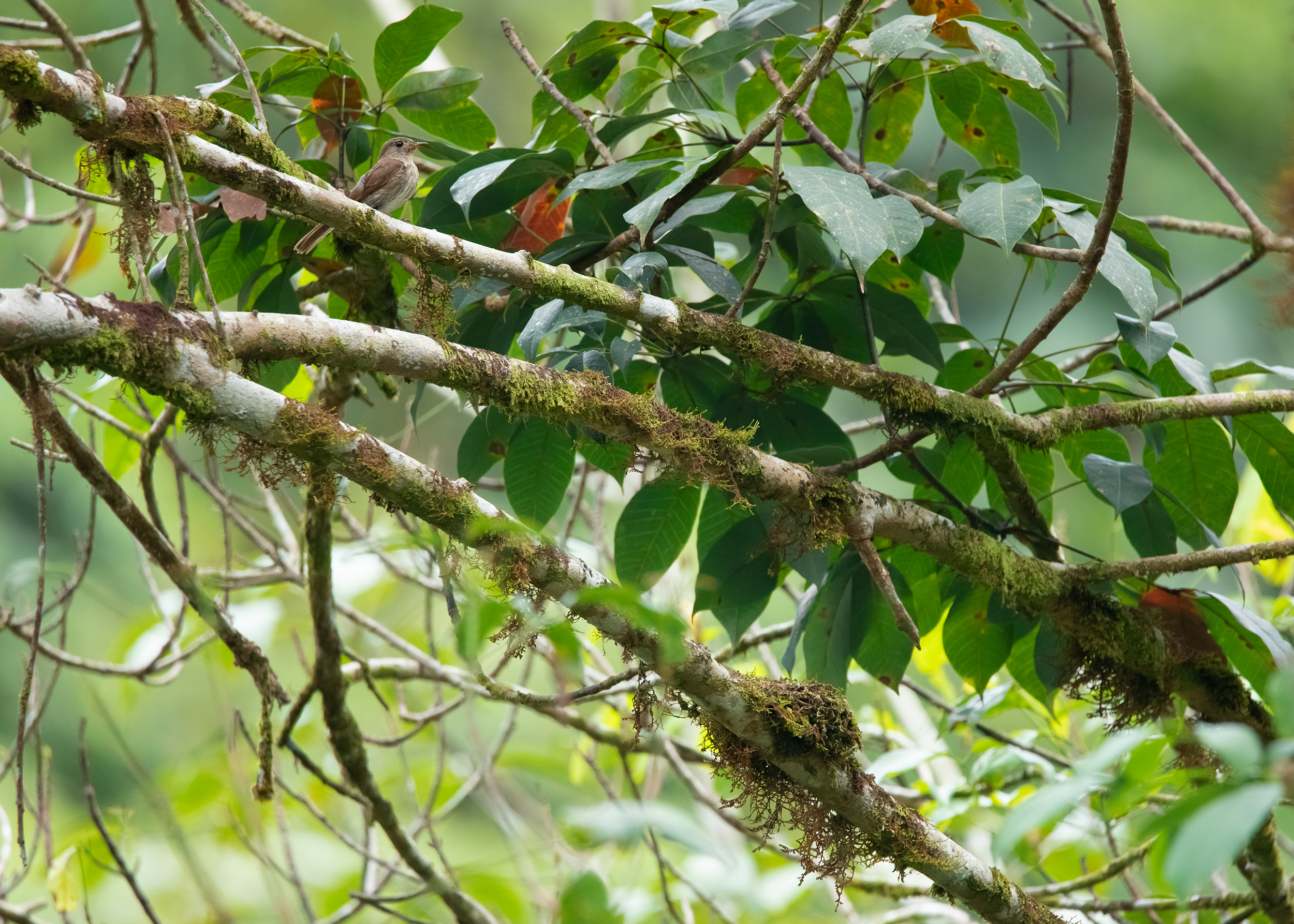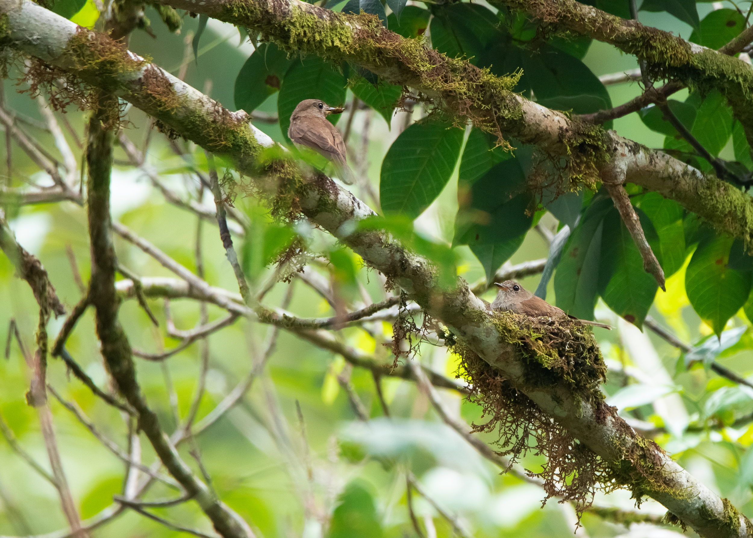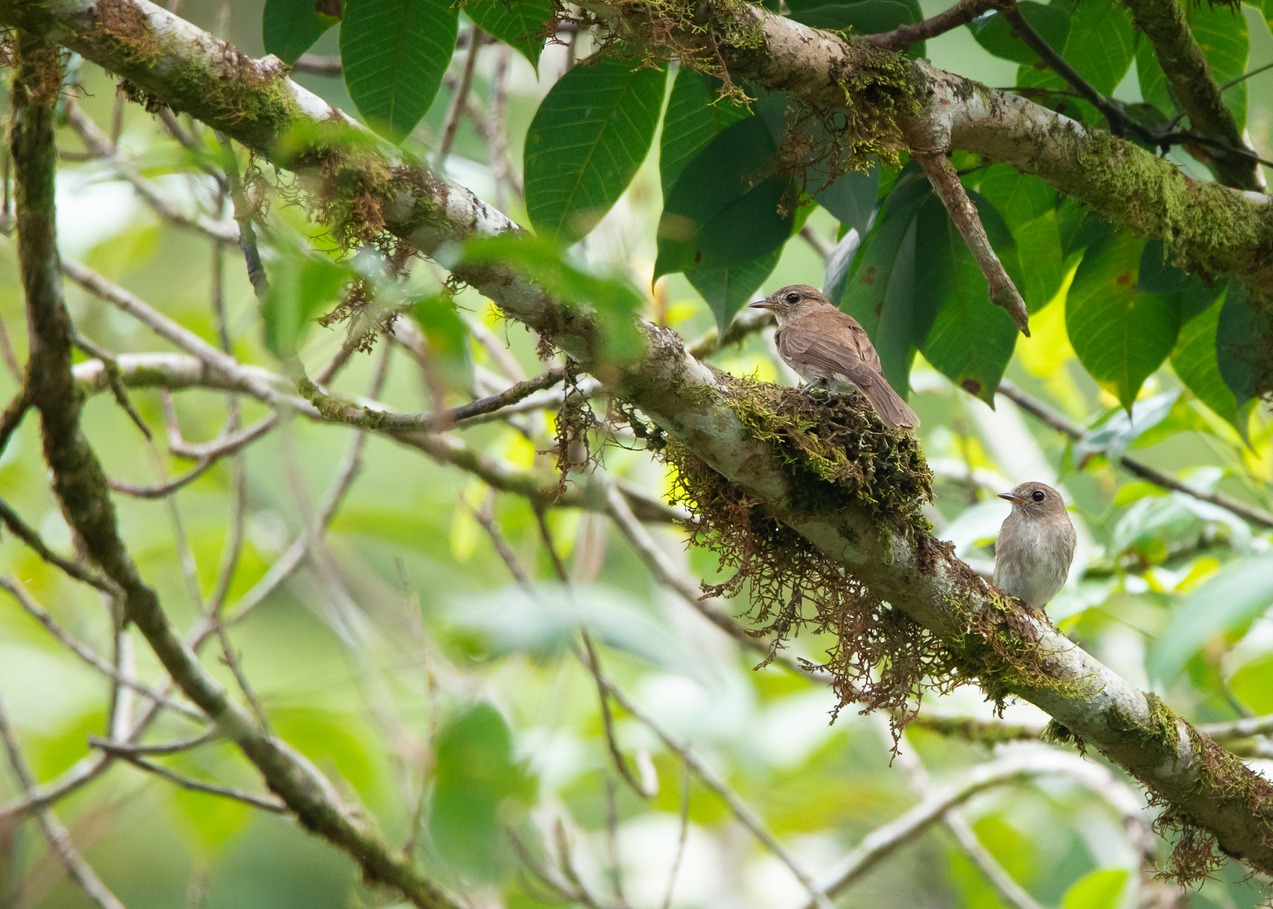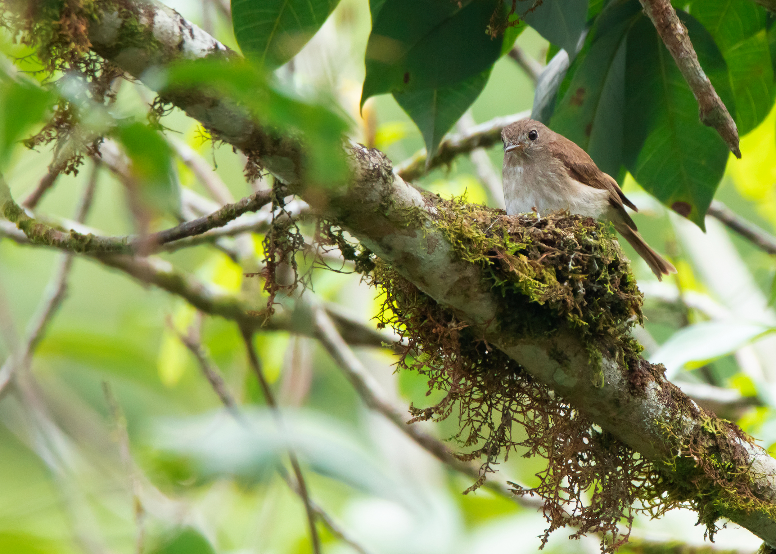 The pair of Umber Flycatchers found by Ingkayut and Jakapat was first seen feeding a recently fledged juvenile in a rubber tree plantation near the entrance of Toh Mo trail. It was later found that there were 2 juveniles in total. Even though both juveniles had already fledged, the adults were still seen visiting the nest regularly. It was suspected that they might use the same nest for a second brood, and it turned out to be true. During my visit, one of the adults, assumed to be the female, spent most of the time sitting on the nest, so I suspected that the eggs were already laid. On one occasion, the male also brought food back to feed the female at the nest. Both fledged juveniles were still seen feeding in the vicinity of the nest, and though they were still begging for food, the adults didn’t seem to care for them anymore.