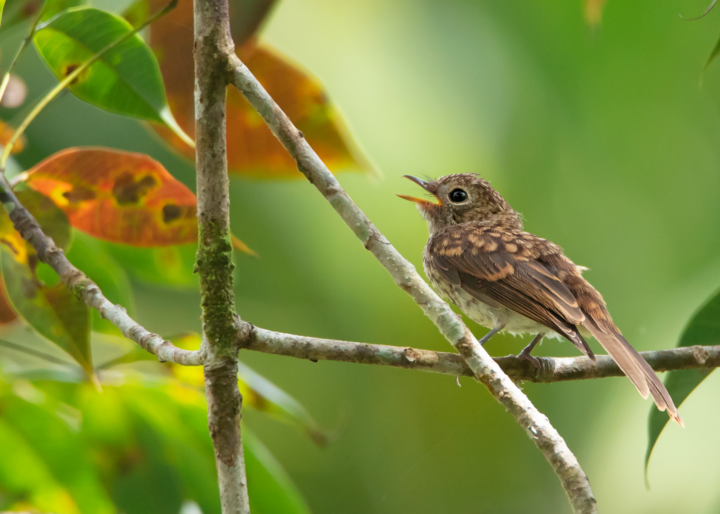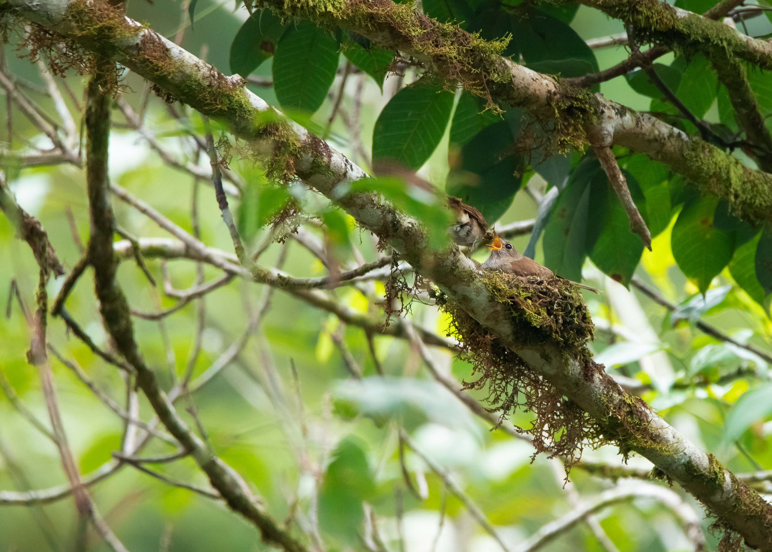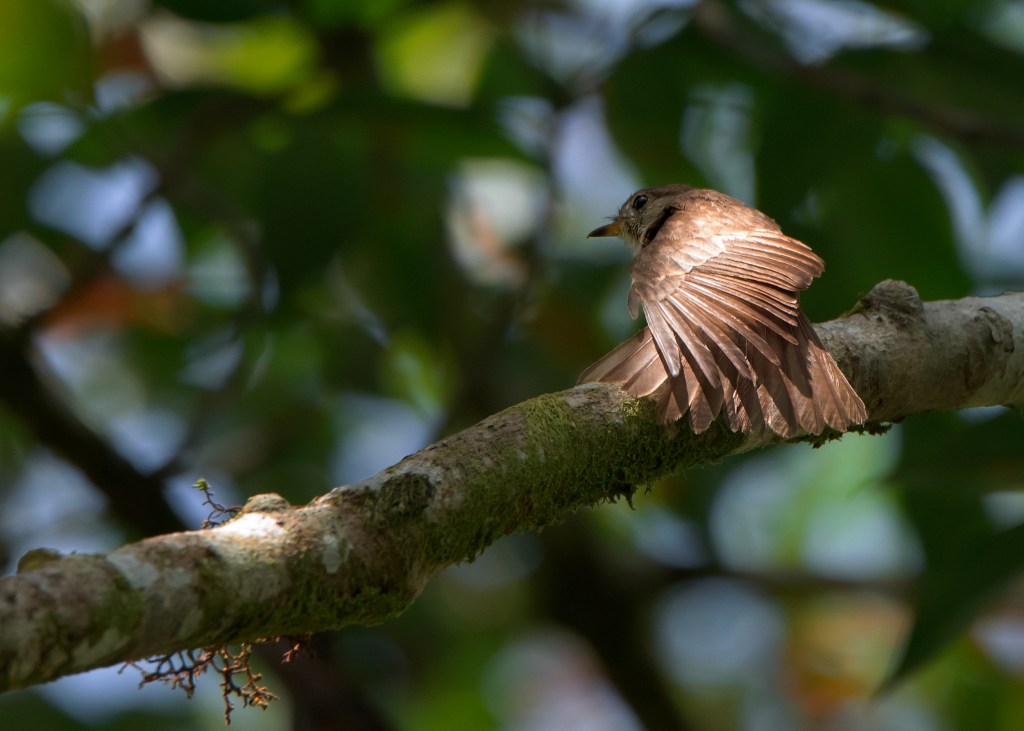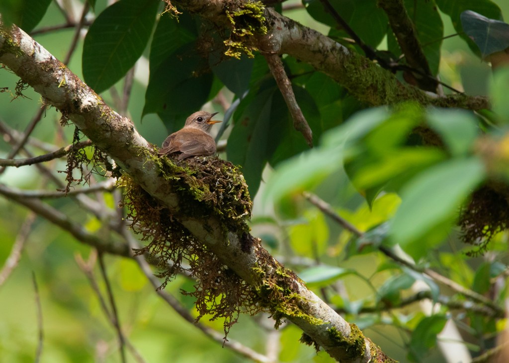 The pair of Umber Flycatchers found by Ingkayut and Jakapat was first seen feeding a recently fledged juvenile in a rubber tree plantation near the entrance of Toh Mo trail. It was later found that there were 2 juveniles in total. Even though both juveniles had already fledged, the adults were still seen visiting the nest regularly. It was suspected that they might use the same nest for a second brood, and it turned out to be true. During my visit, one of the adults, assumed to be the female, spent most of the time sitting on the nest, so I suspected that the eggs were already laid. On one occasion, the male also brought food back to feed the female at the nest. Both fledged juveniles were still seen feeding in the vicinity of the nest, and though they were still begging for food, the adults didn’t seem to care for them anymore.